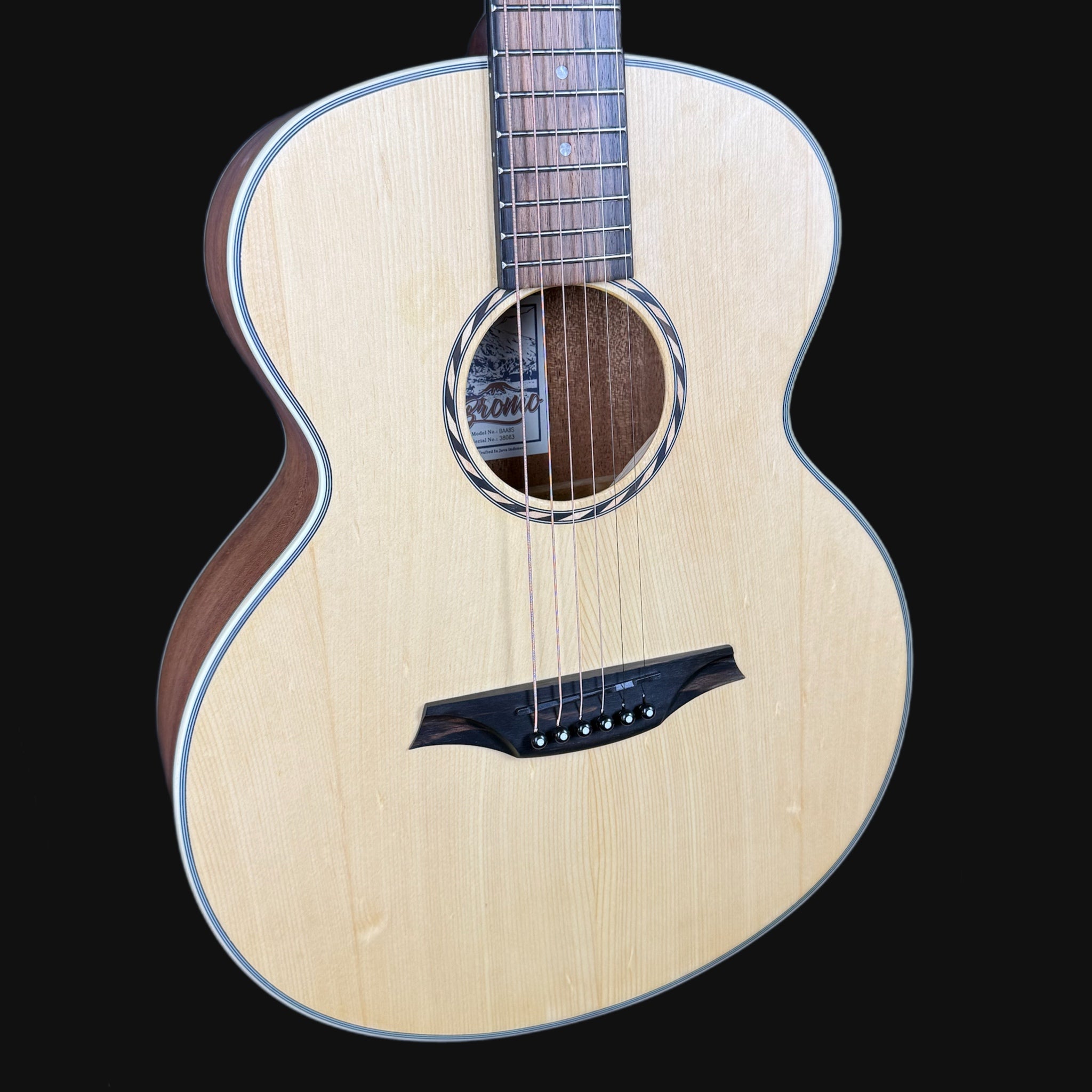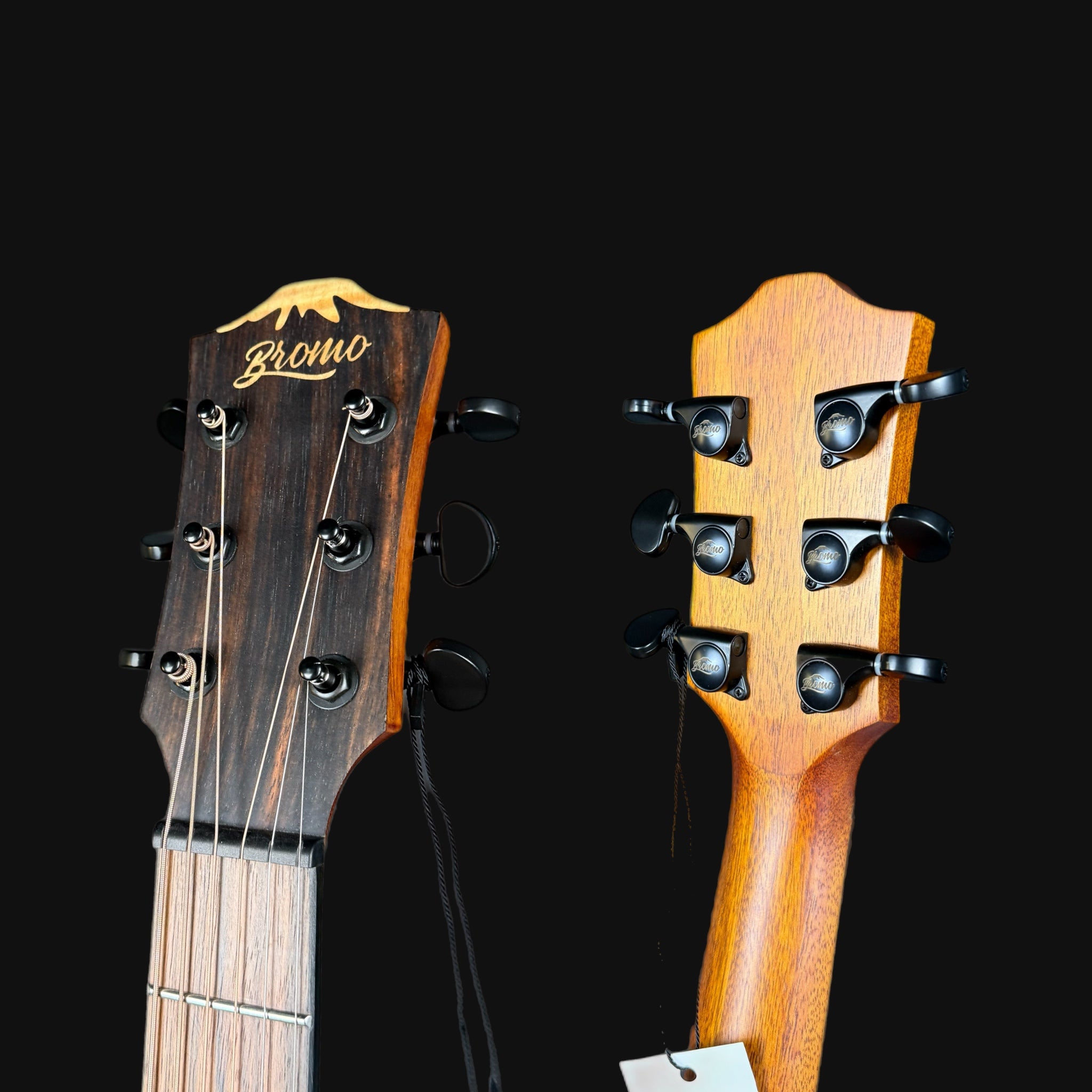 The Bromo BAA8S is a gem for guitar enthusiasts. This mini jumbo-shaped guitar strikes a perfect balance between playability and size, making it a versatile choice for various musical settings. Its solid spruce top ensures a rich, resonant tone, while the layered mahogany back and sides enhance the tonal range, giving you a full and balanced sound.