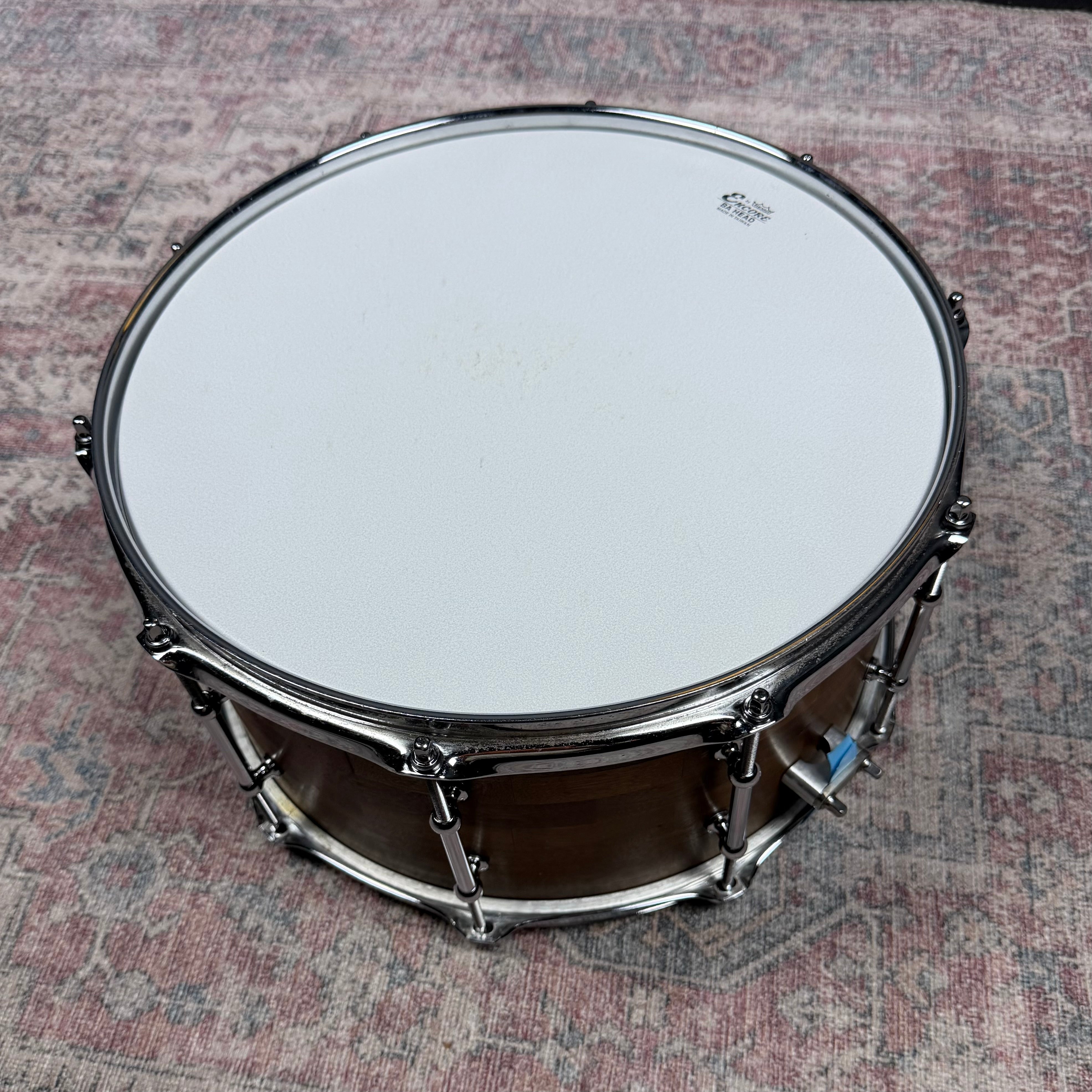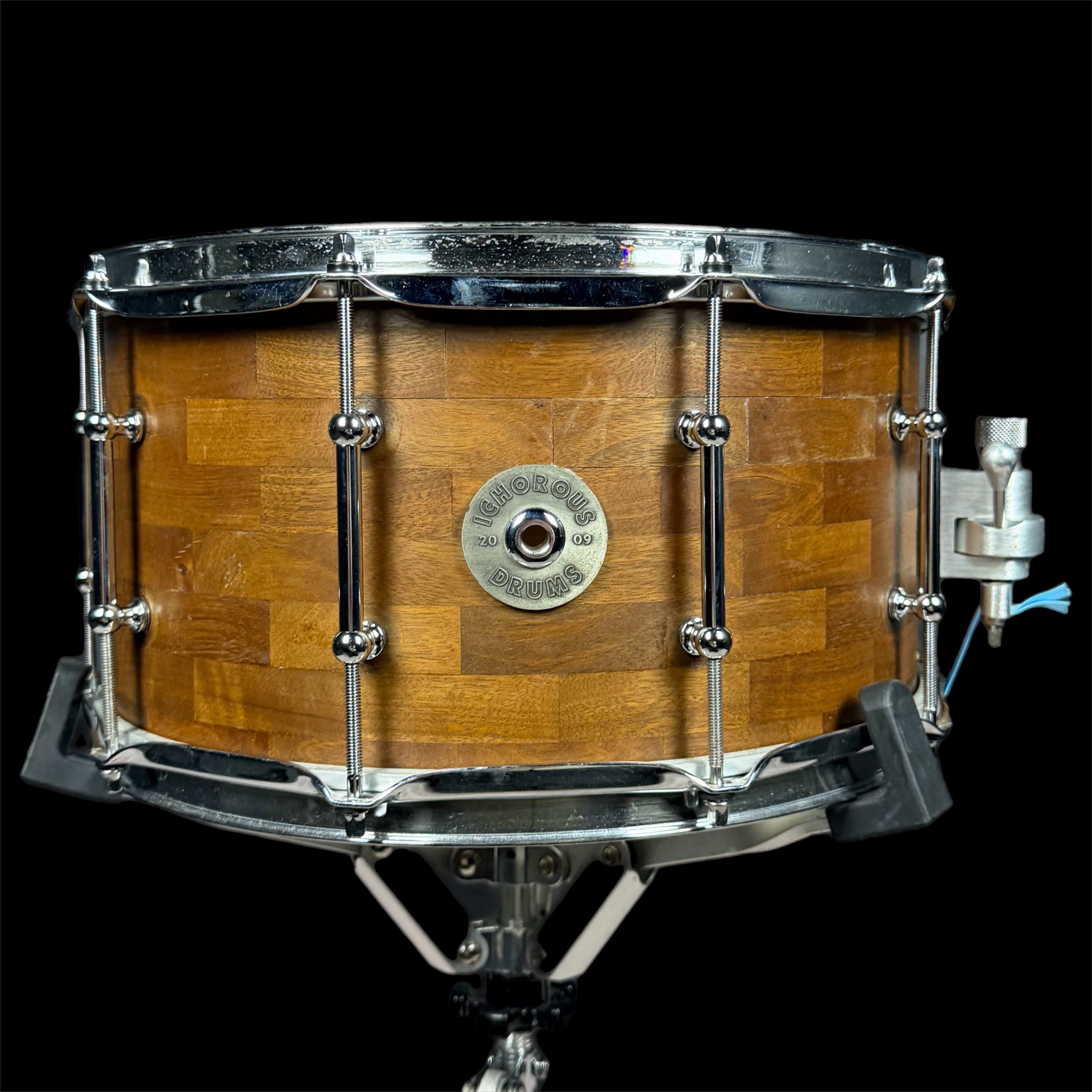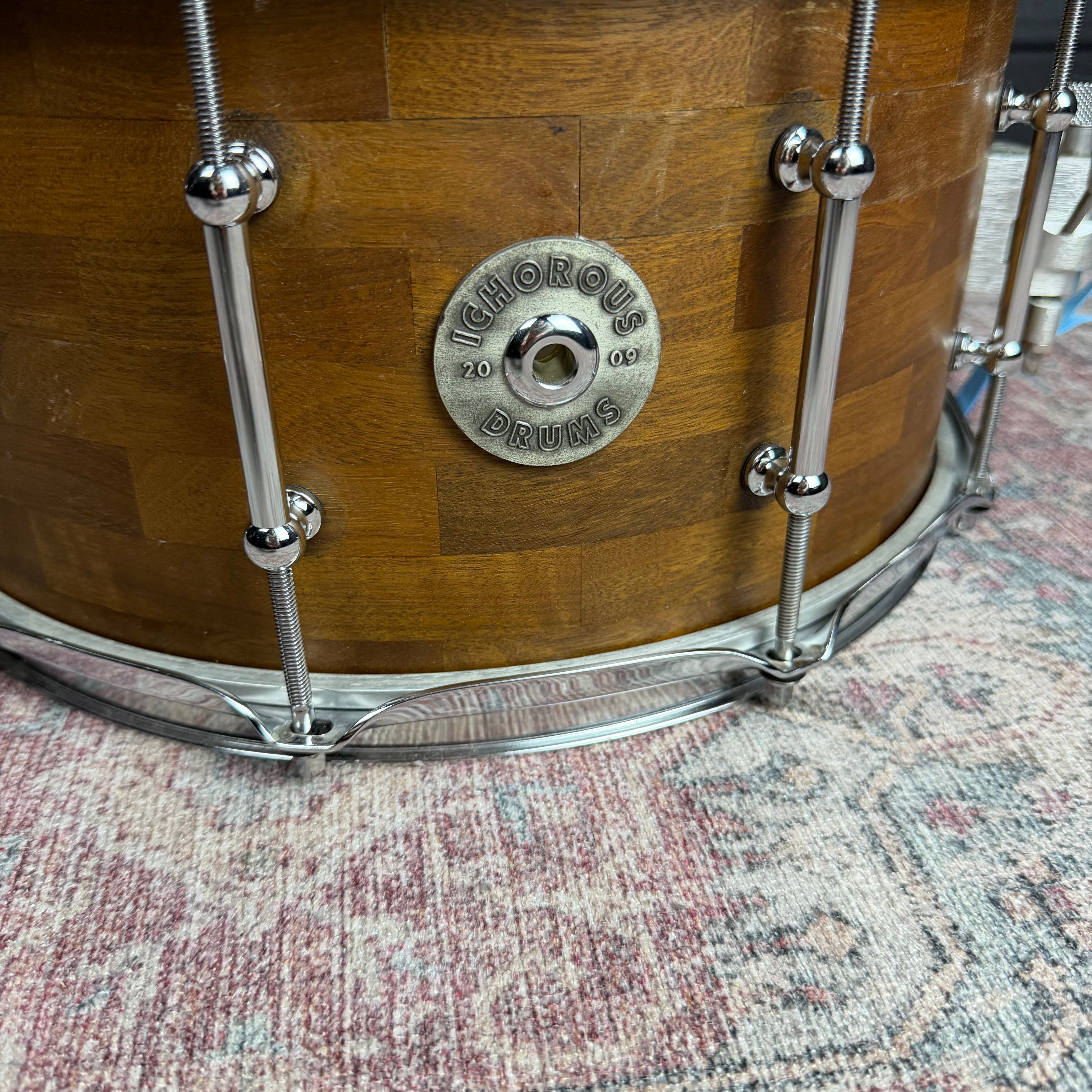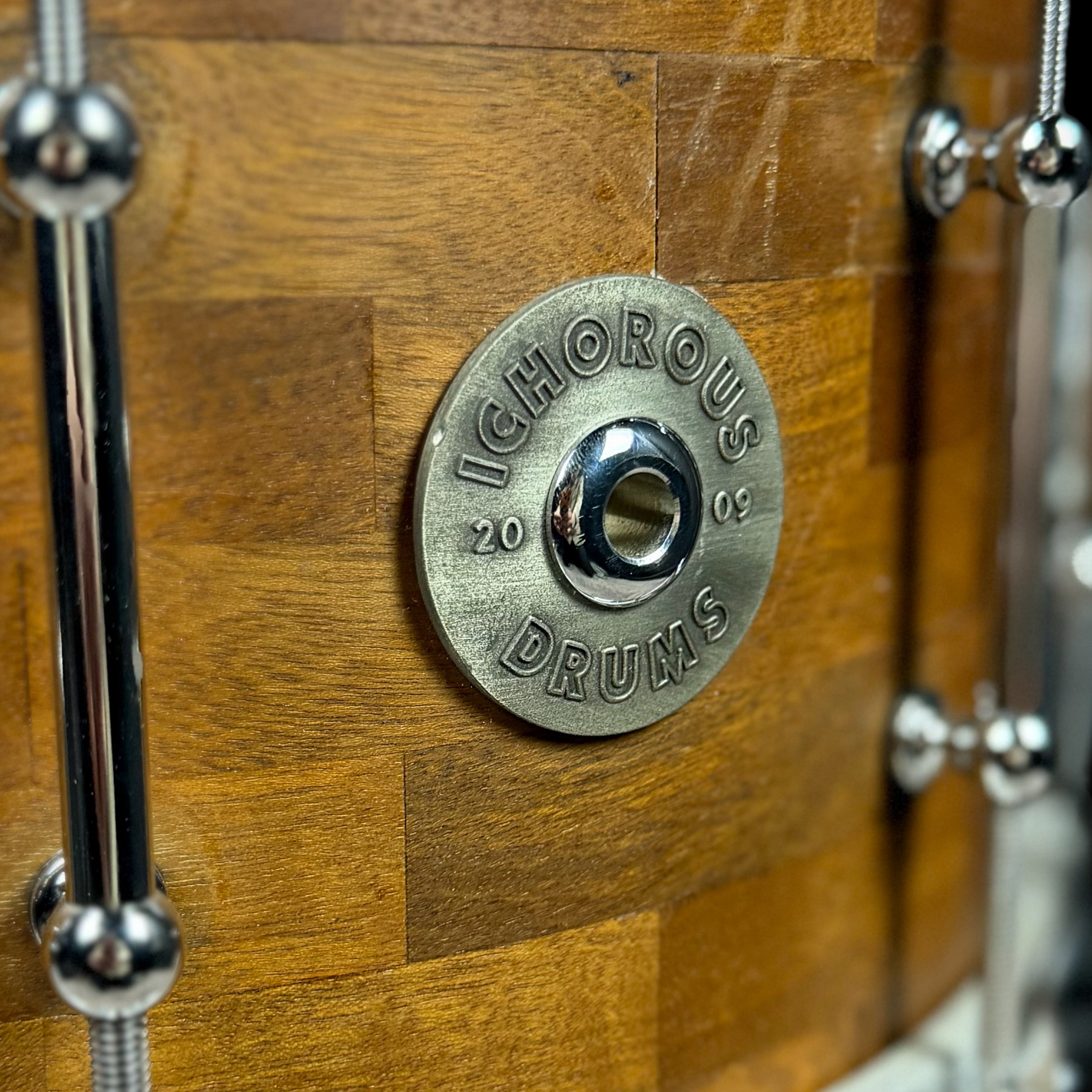 Crafted in 2009, this Ichorus stave block snare drum represents the work of a small, boutique American builder dedicated to tone-forward design and meticulous construction. Produced in limited numbers, Ichorus drums were never mass manufactured, making surviving examples both uncommon and highly respected among discerning players.