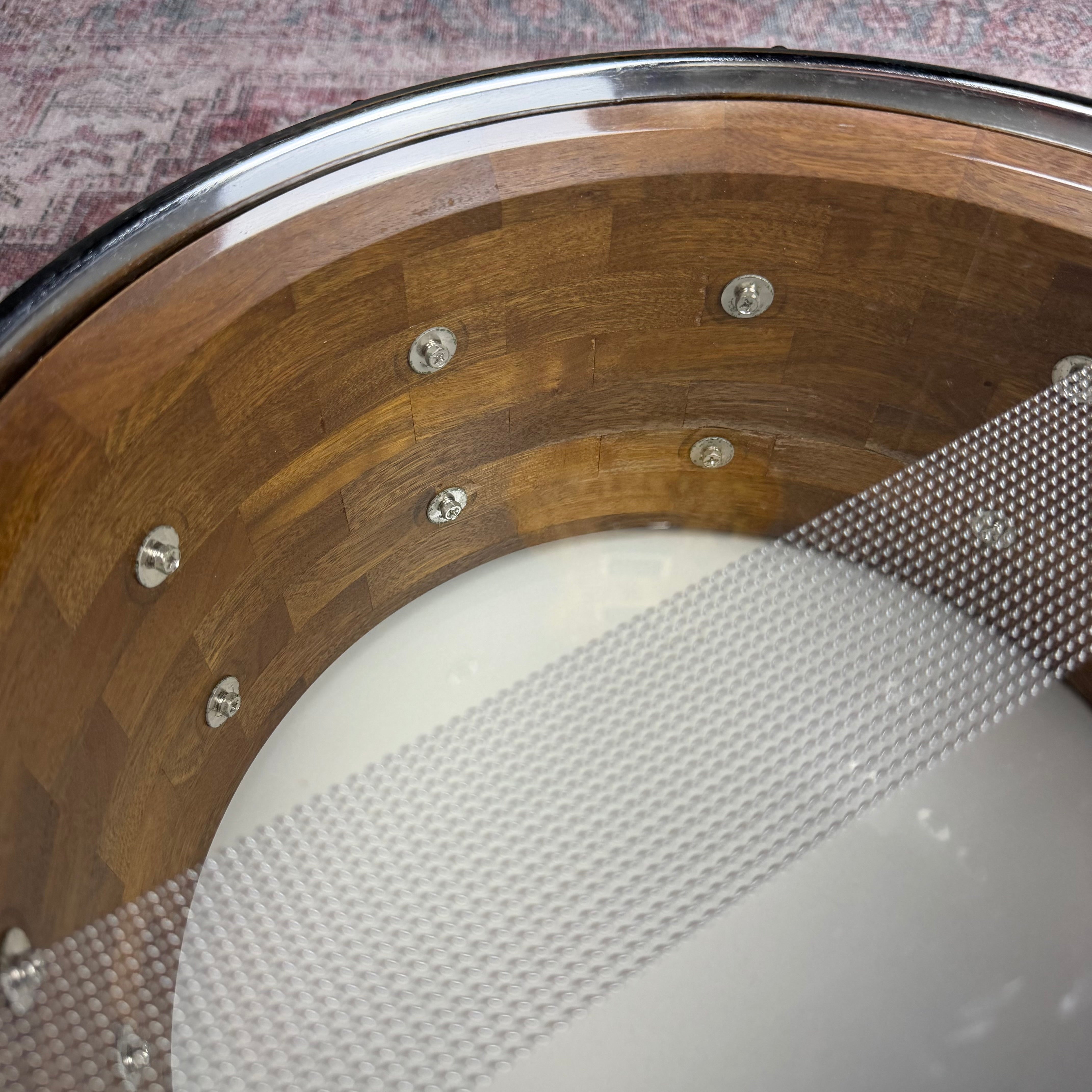 The shell is constructed from vertically aligned hardwood staves, precision-glued and lathe-turned into a solid cylinder. This stave block construction delivers exceptional focus, projection, and clarity, with a pronounced low-mid presence and a fast, articulate response. The result is a snare that speaks easily at low dynamics and delivers a powerful, controlled crack when pushed.