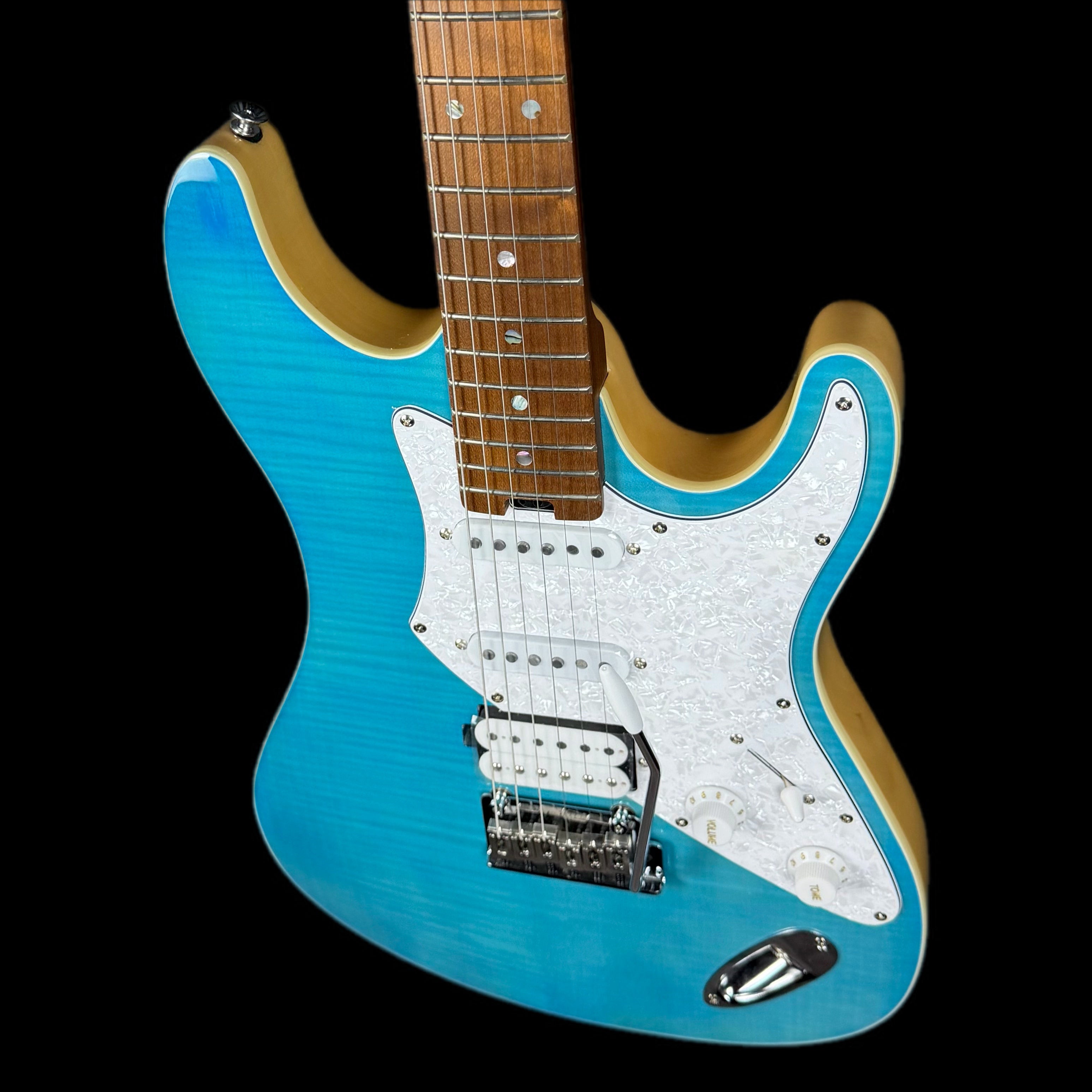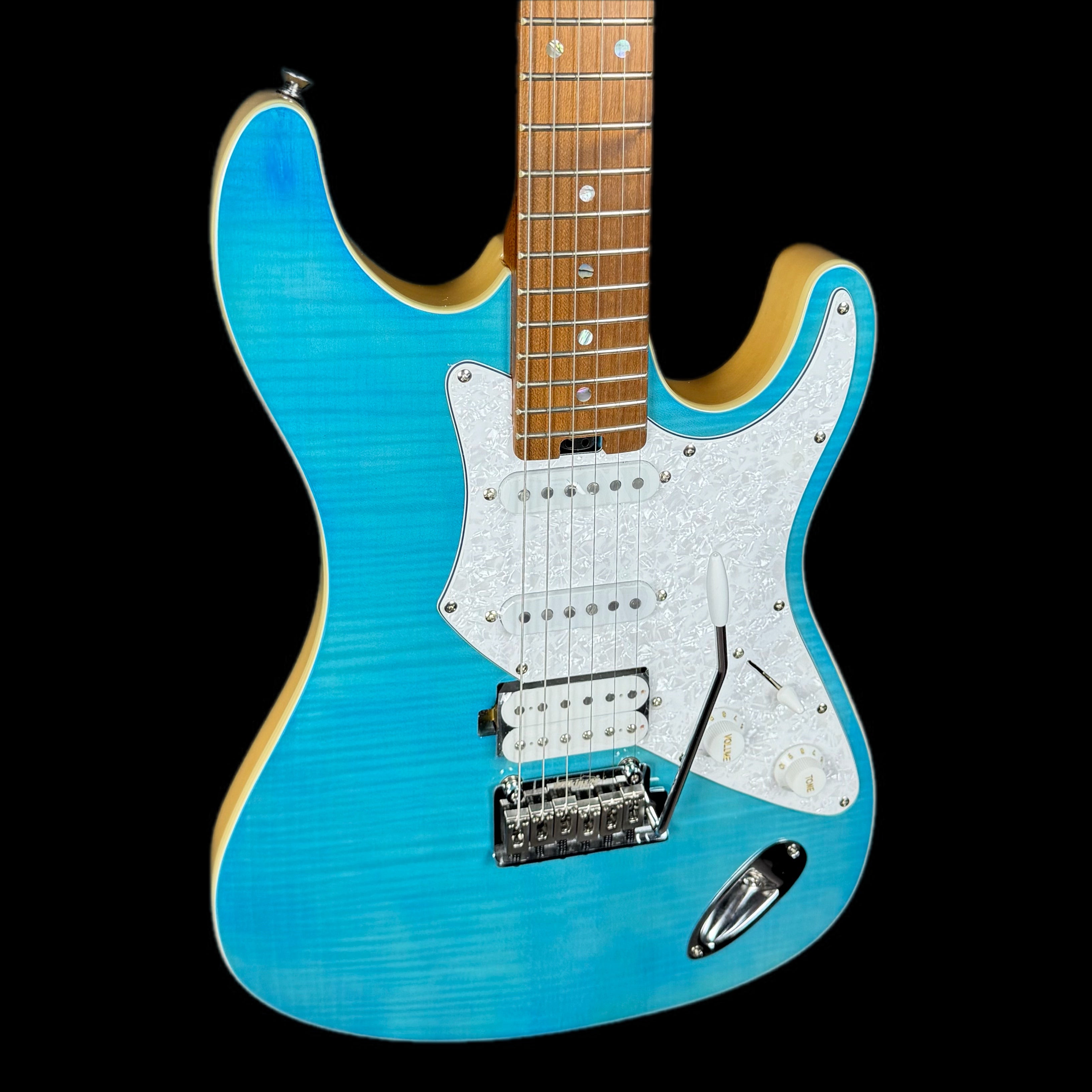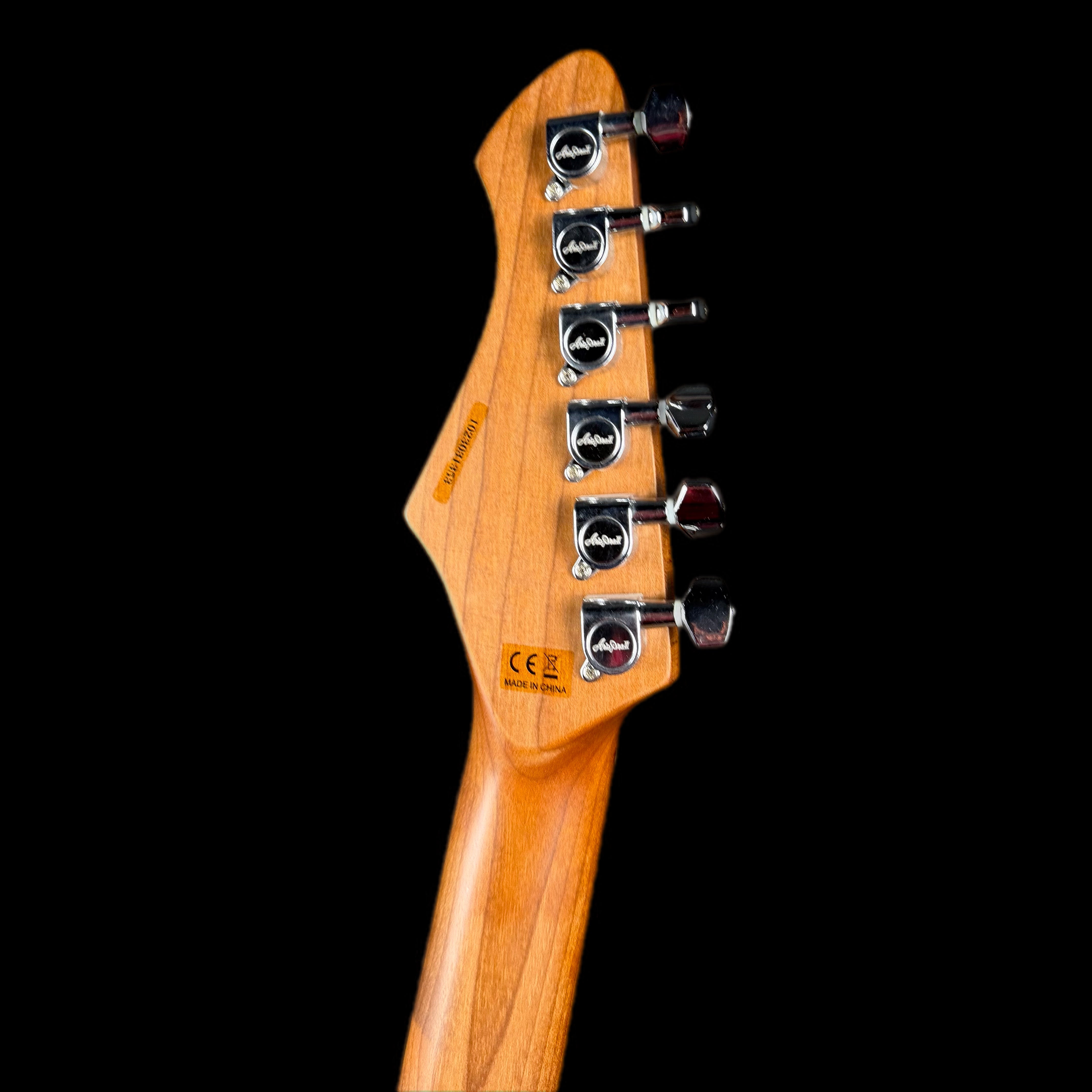Roasted maple neck and fingerboard generate a superior tone that’s boosted by alnico-5 pickups. Wilkinson bridge enables you to have a silky smooth tremolo action.