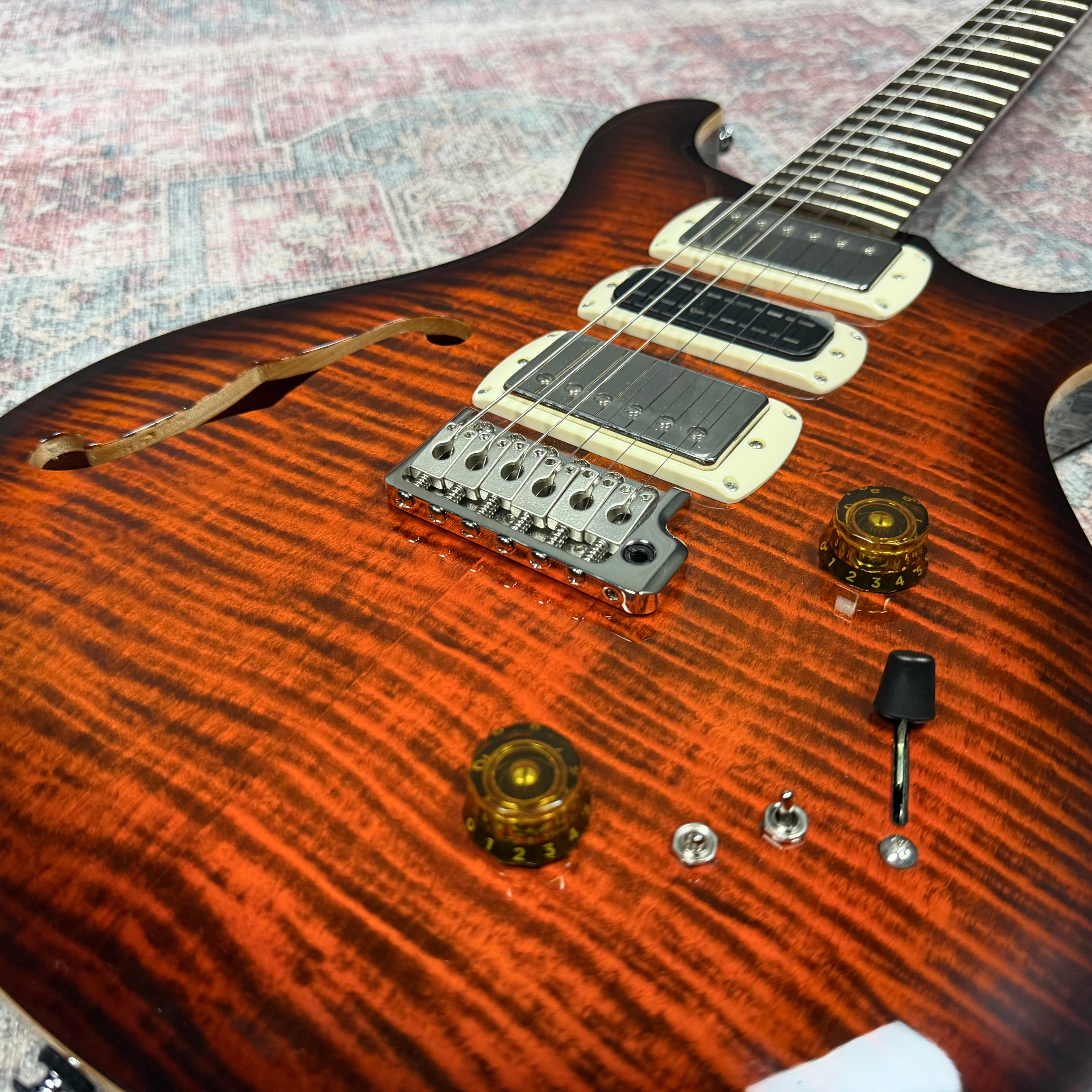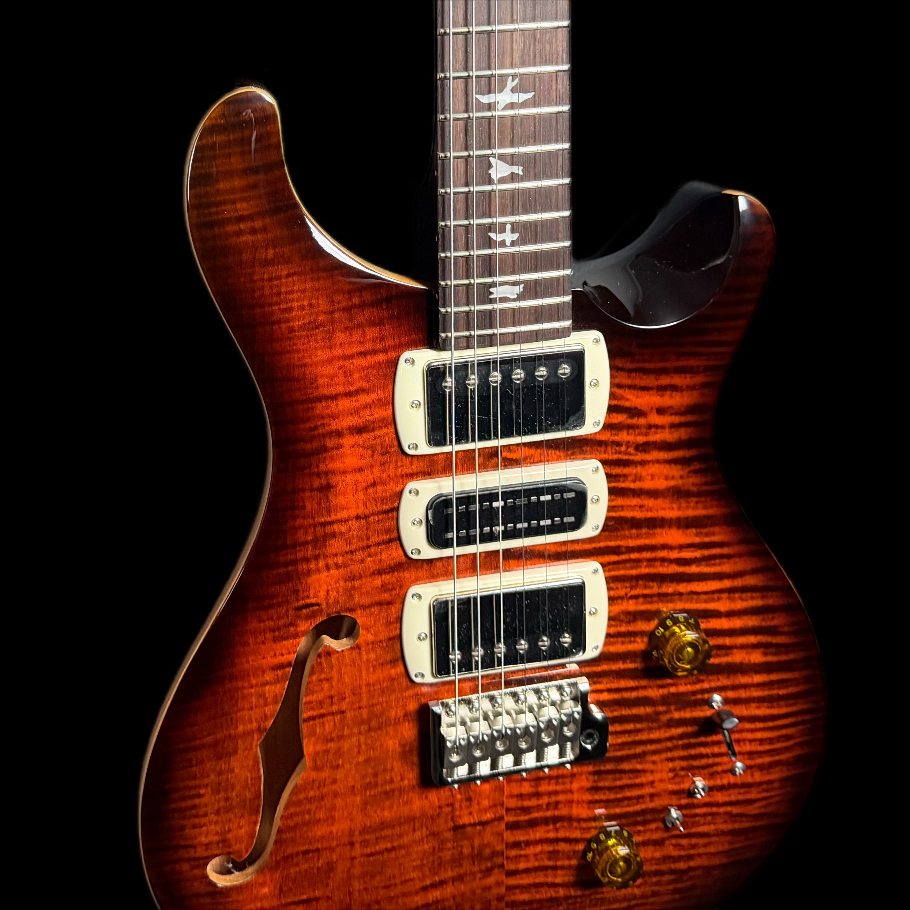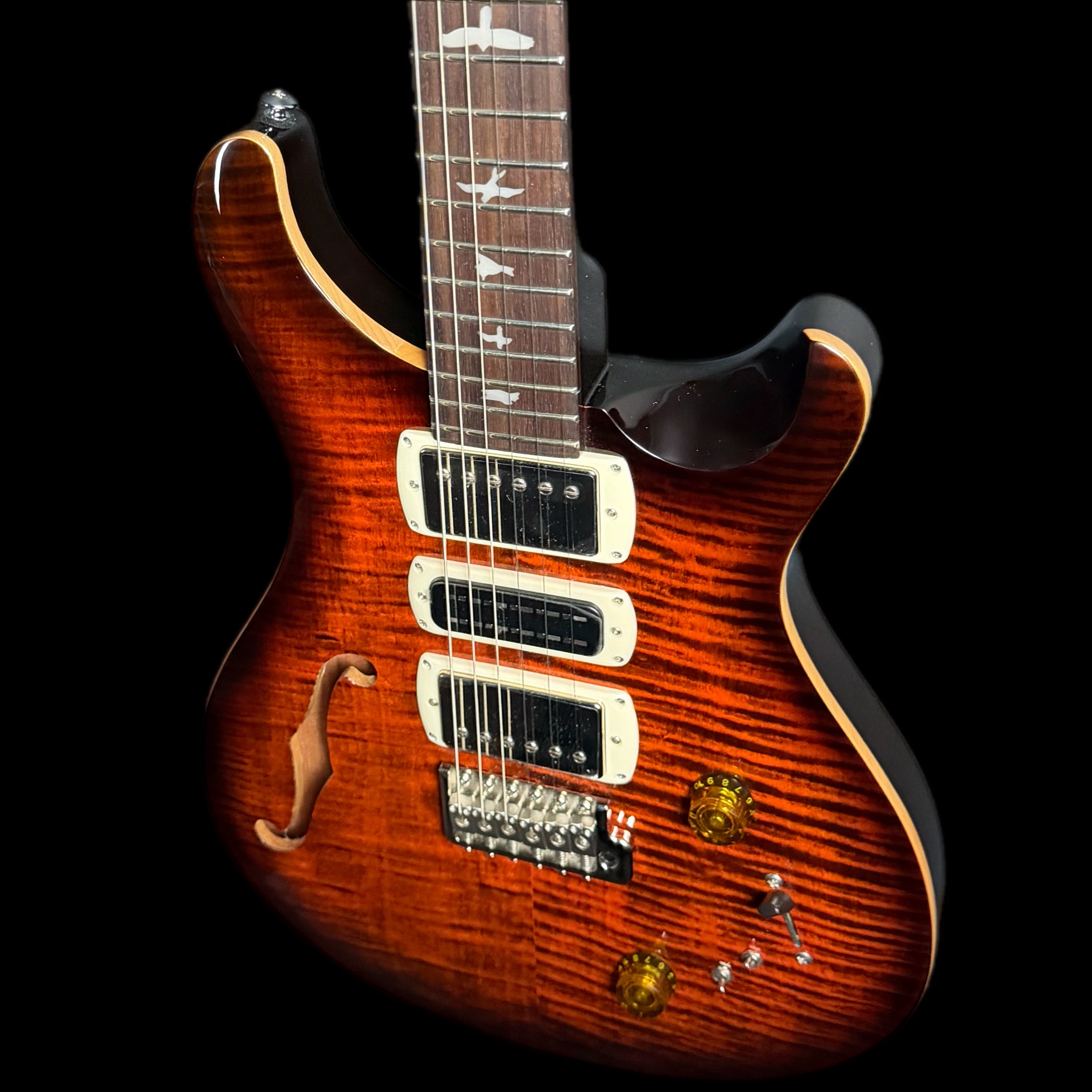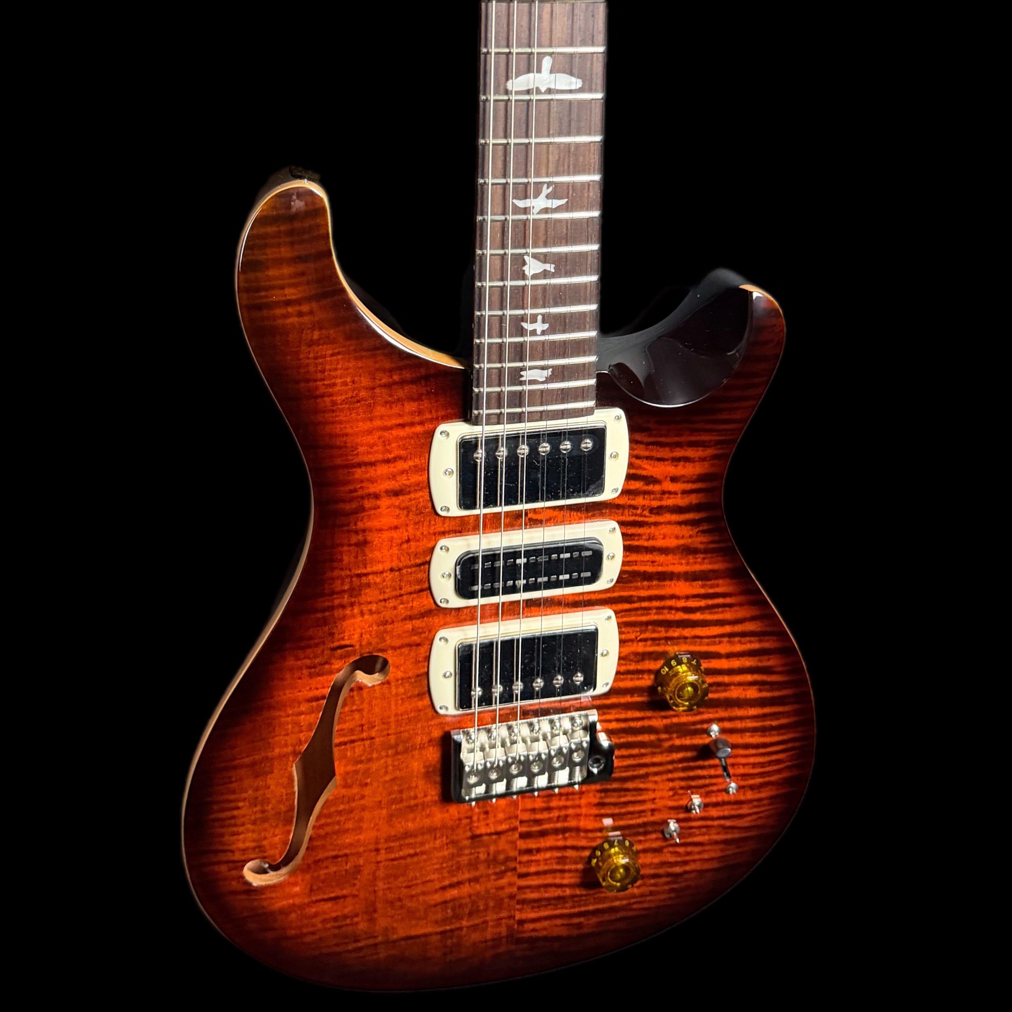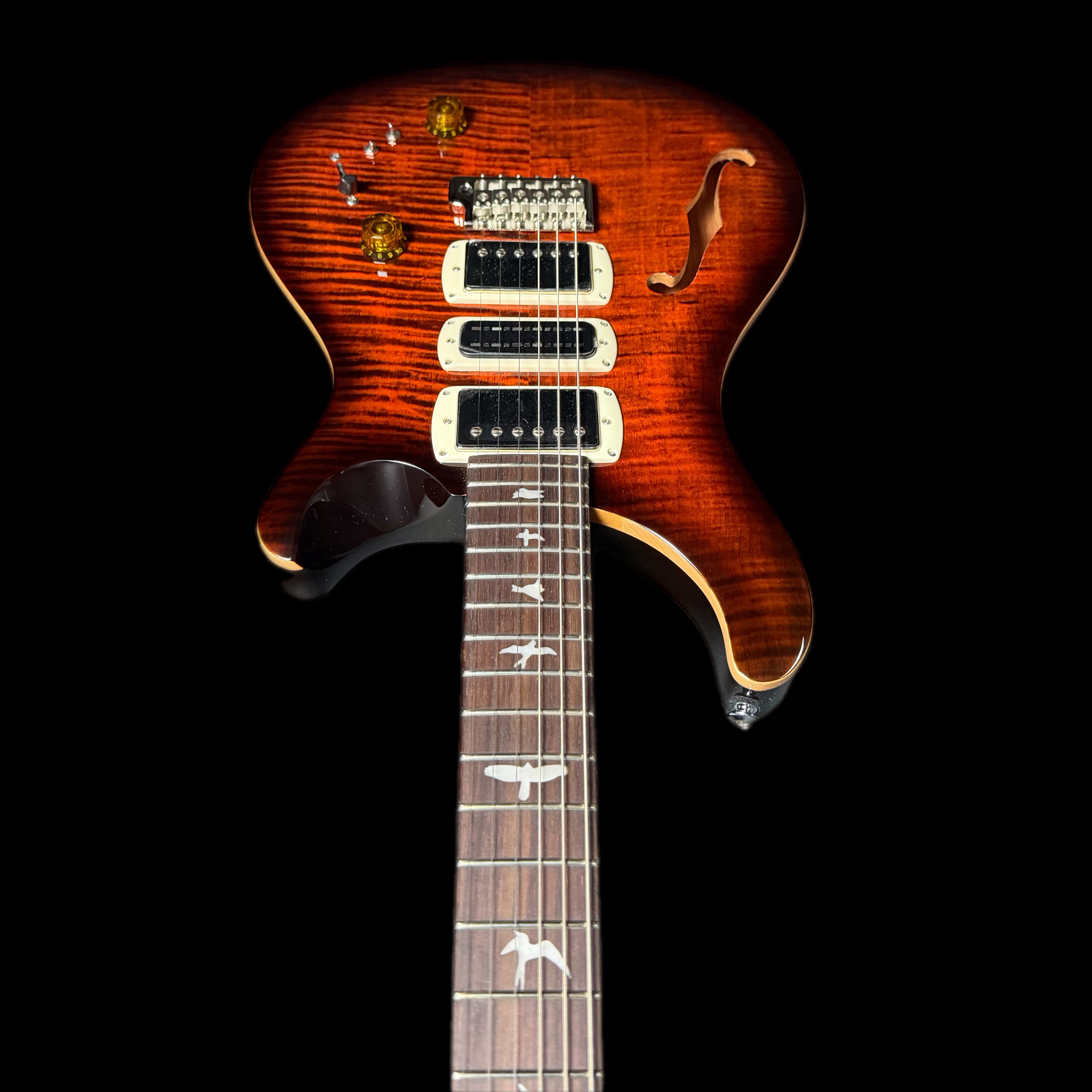 Equipped with a pair of 58/15 LT "S" pickups and a PRS Narrowfield DD "S" in the middle position, the SE Special Semi-Hollow provides a wide range of tonal options. The coil-tap system allows players to switch between full humbucker tones and articulate single-coil sounds, making the guitar suitable for genres including jazz, blues, rock, and pop. With twelve possible pickup configurations, it delivers consistent flexibility whether in the studio or on stage, ensuring players can easily adapt their sound to different musical settings.