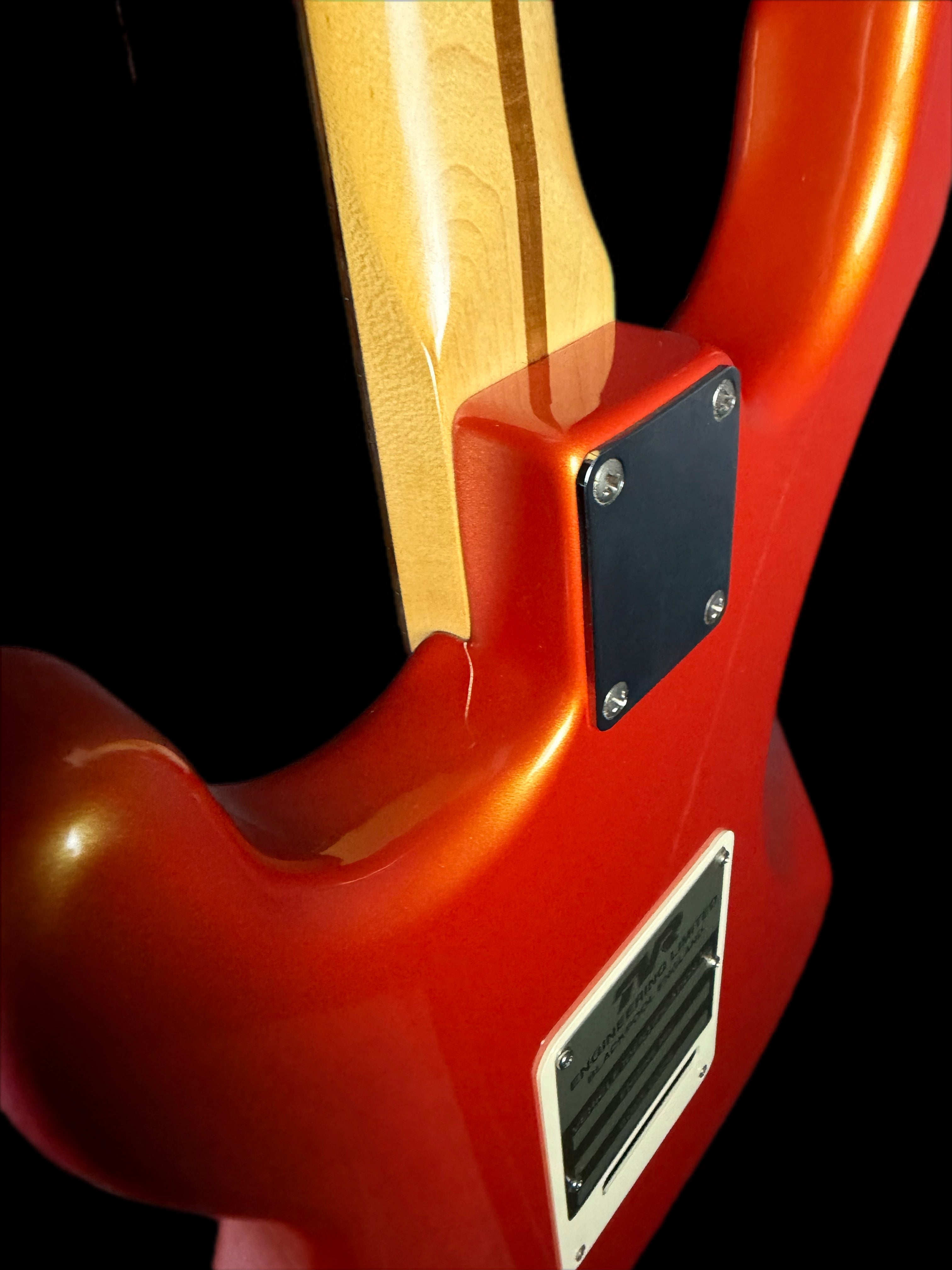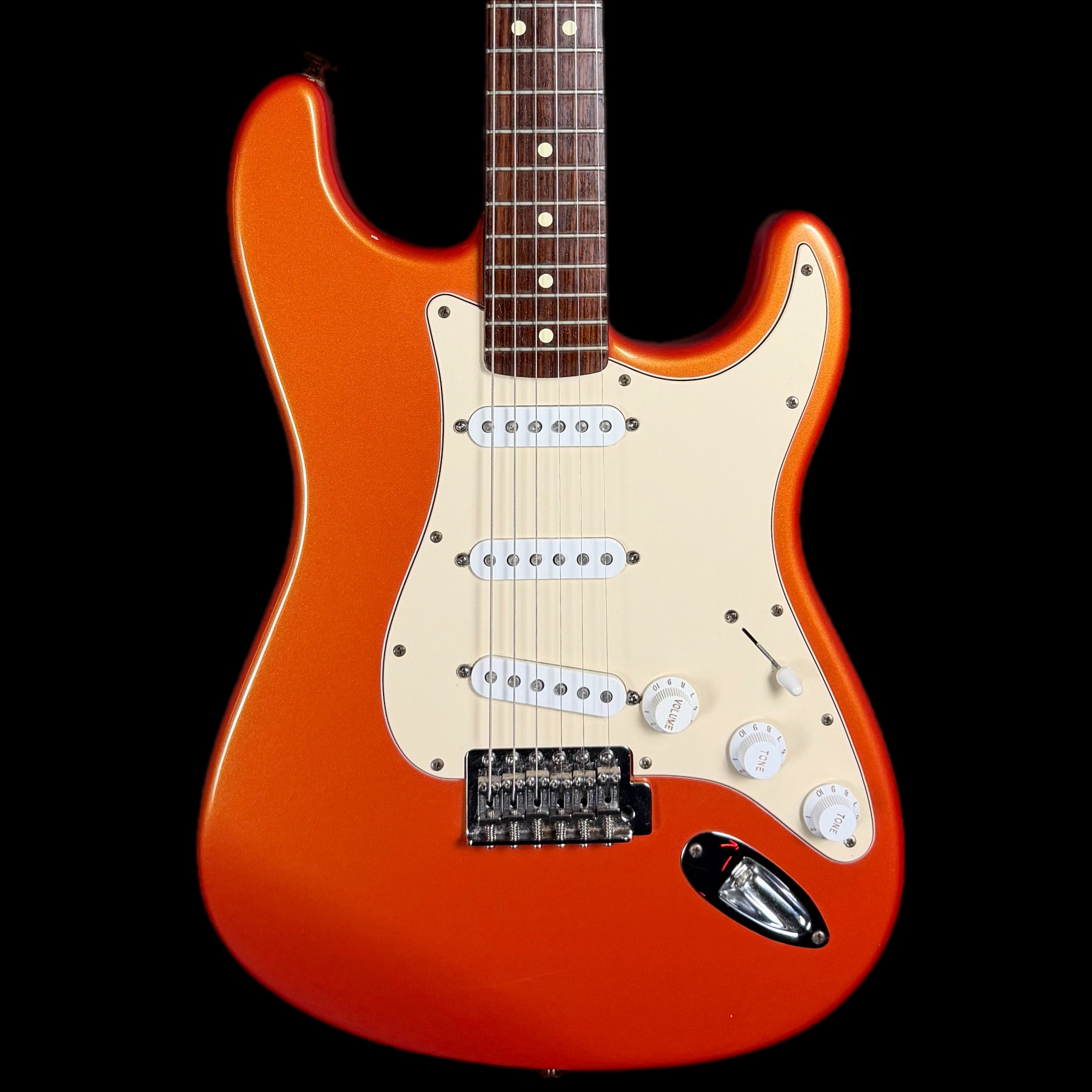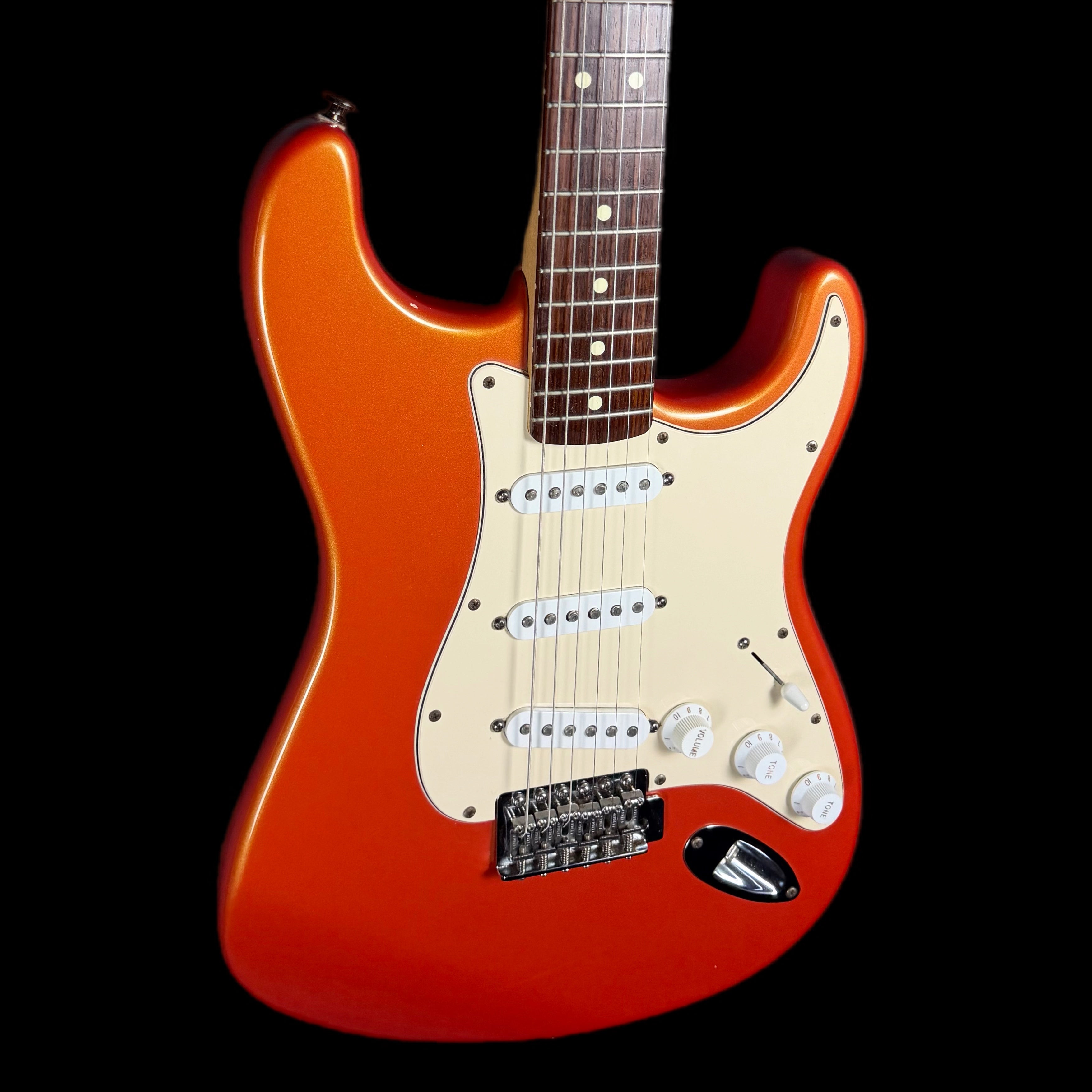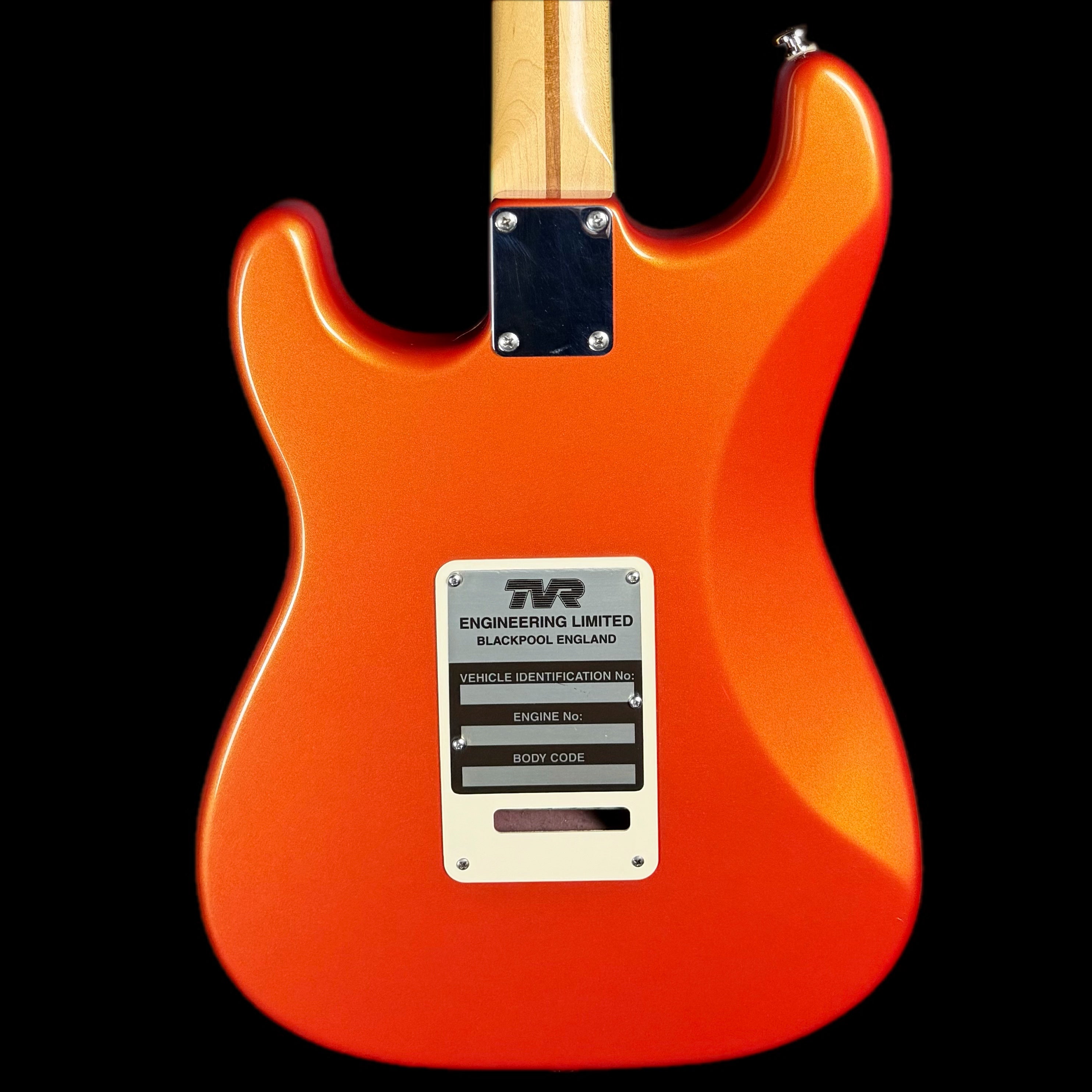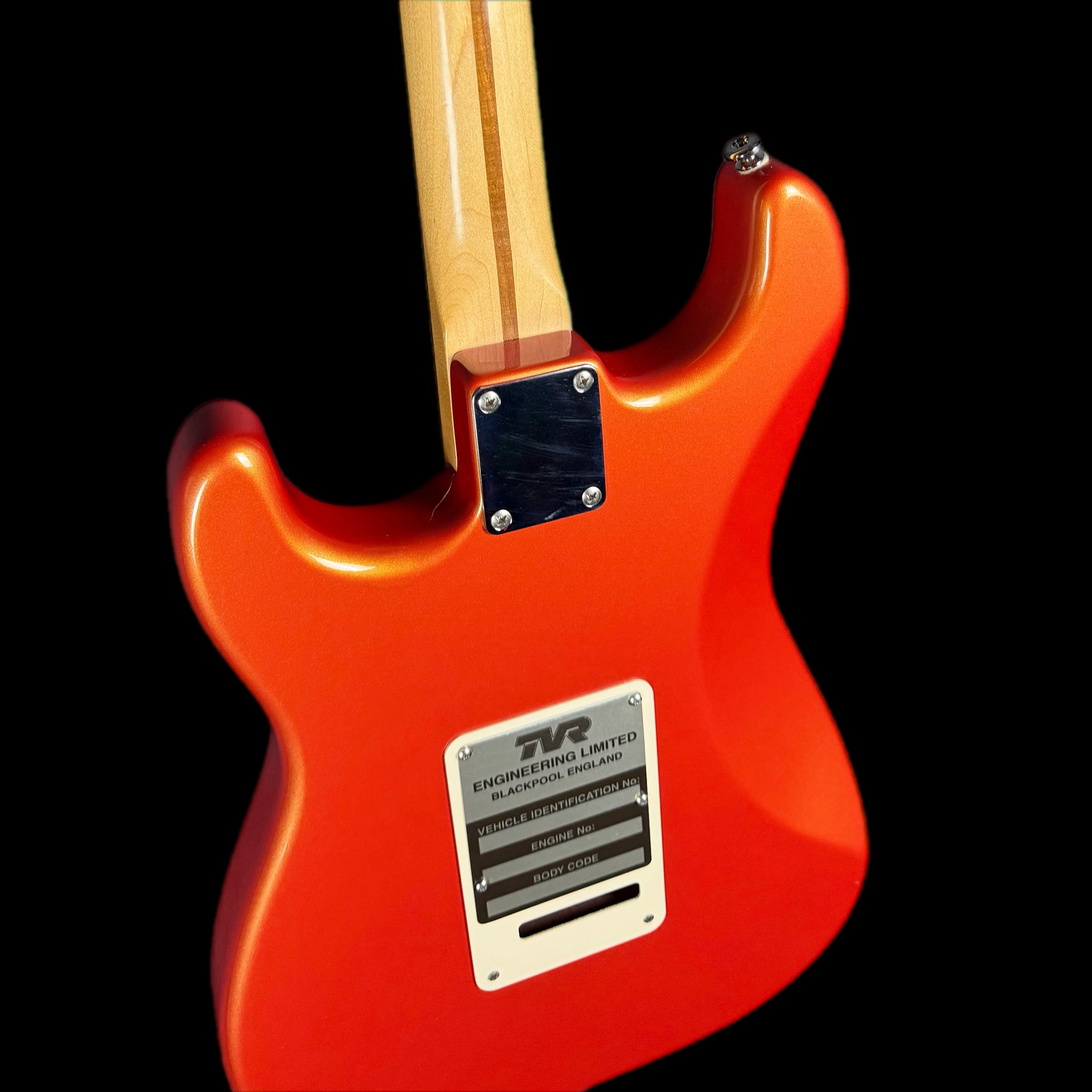 2004 Fender Standard Series Stratocaster featuring a rosewood fingerboard, professionally refinished in a striking TVR Chameleon Orange. Under the lights it shifts and pops, giving the classic Strat silhouette a fresh, modern edge.