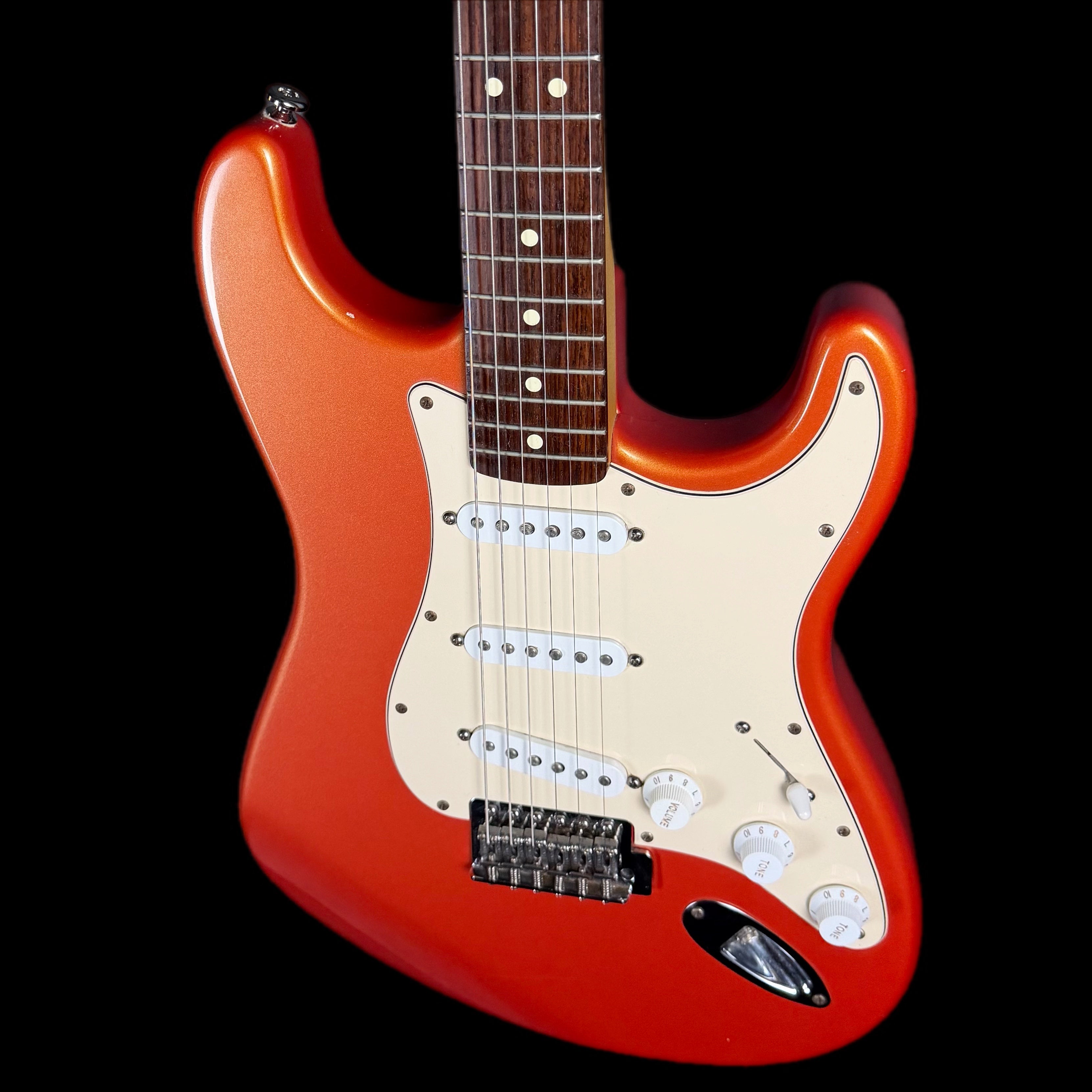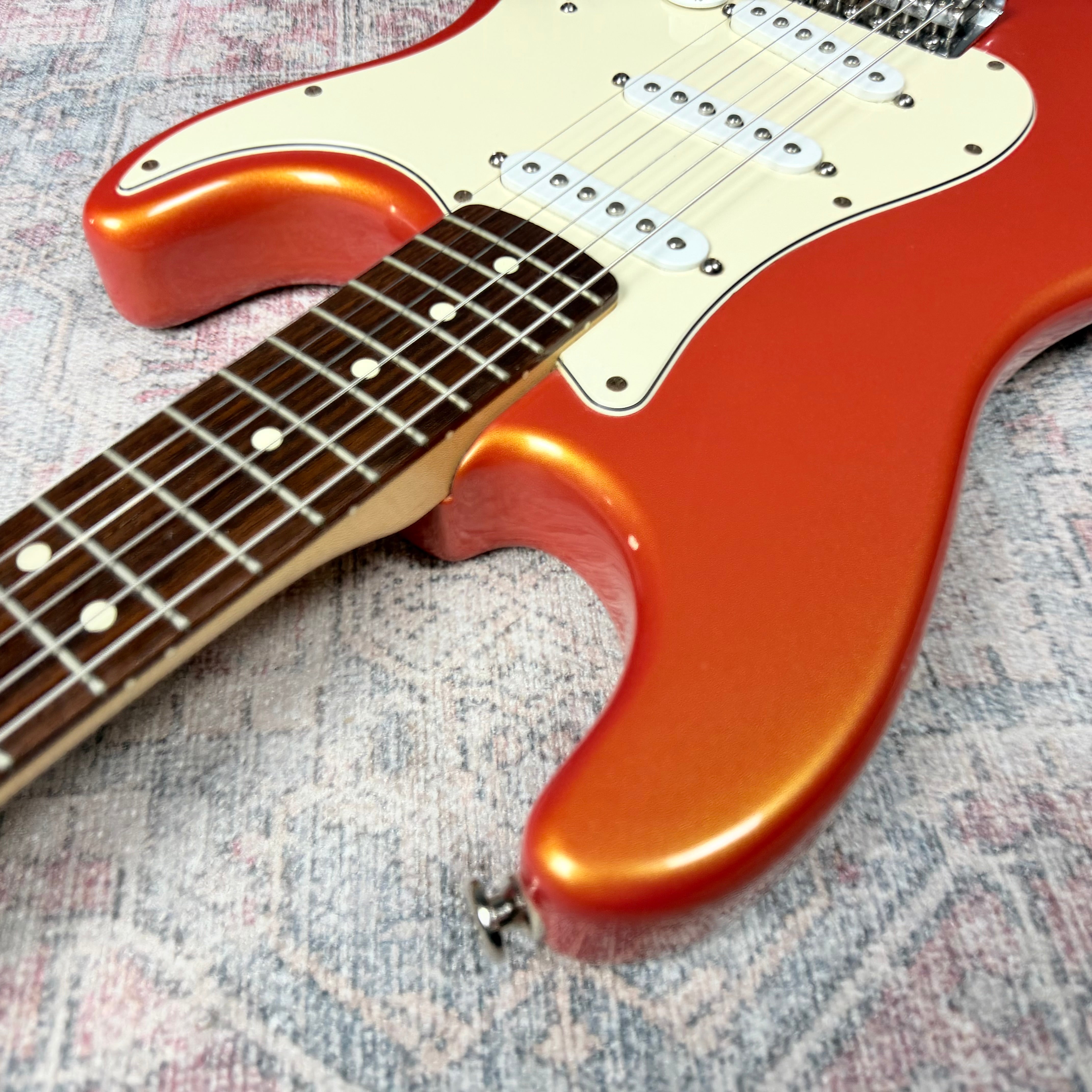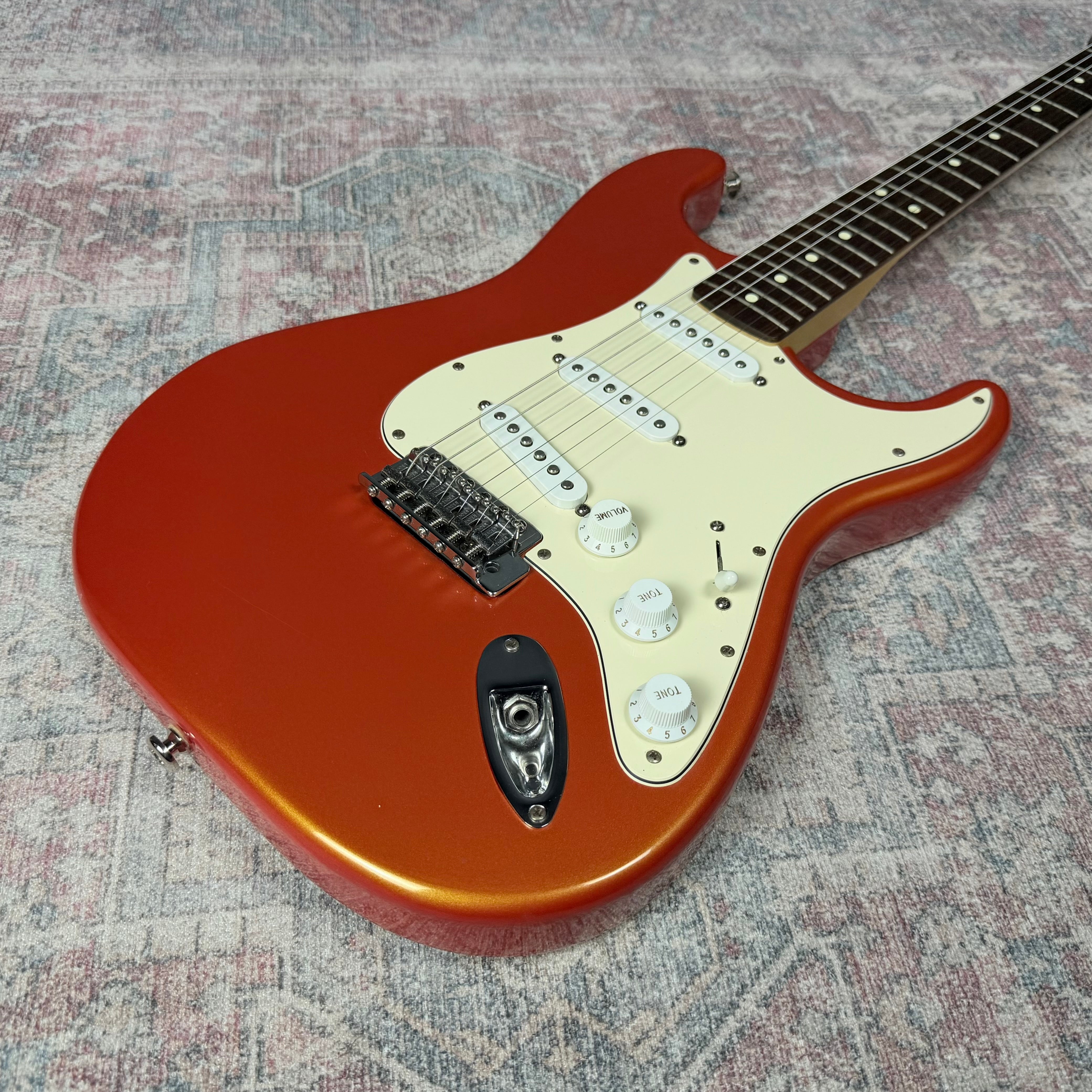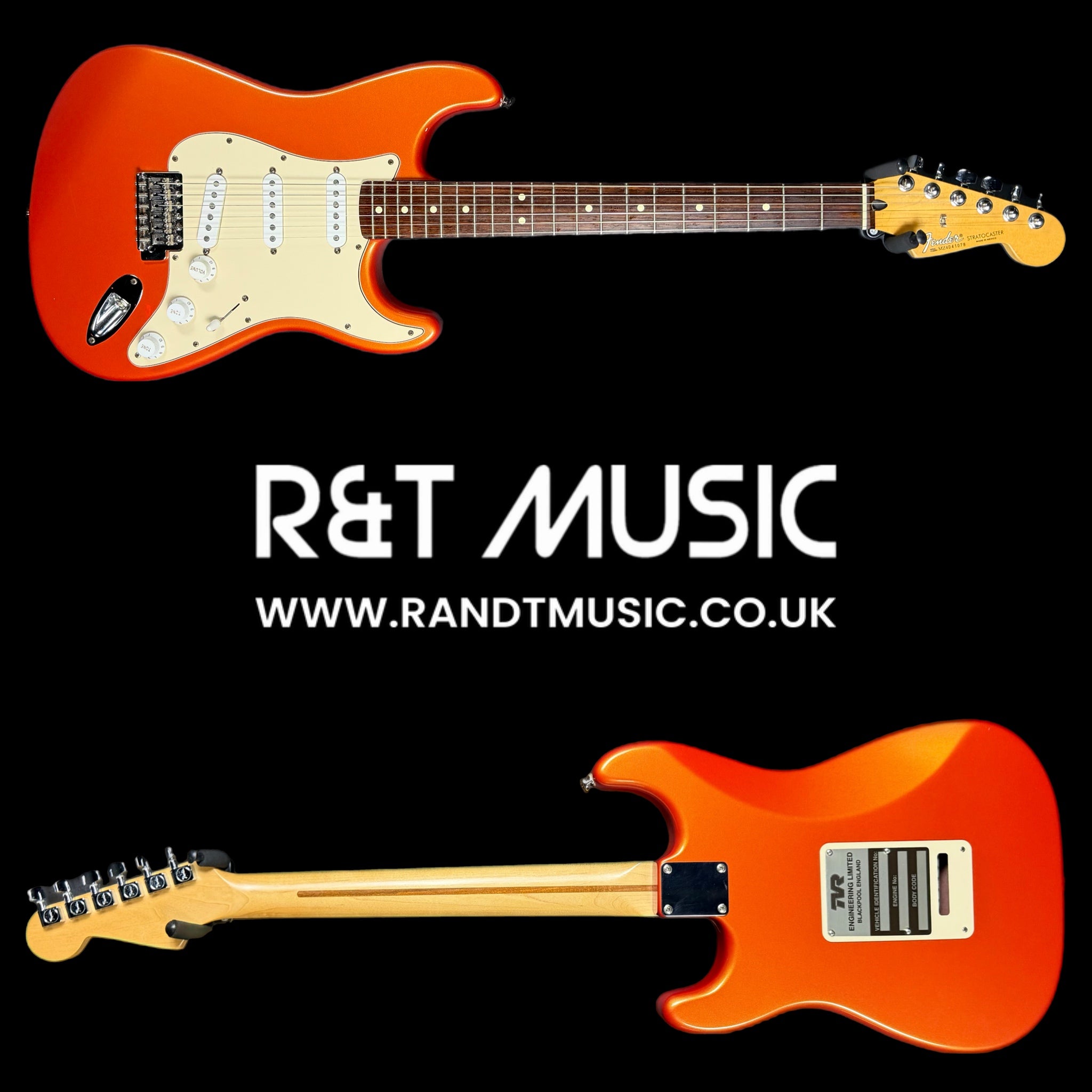 2004 Fender Standard Series Stratocaster featuring a rosewood fingerboard, professionally refinished in a striking TVR Chameleon Orange. Under the lights it shifts and pops, giving the classic Strat silhouette a fresh, modern edge.