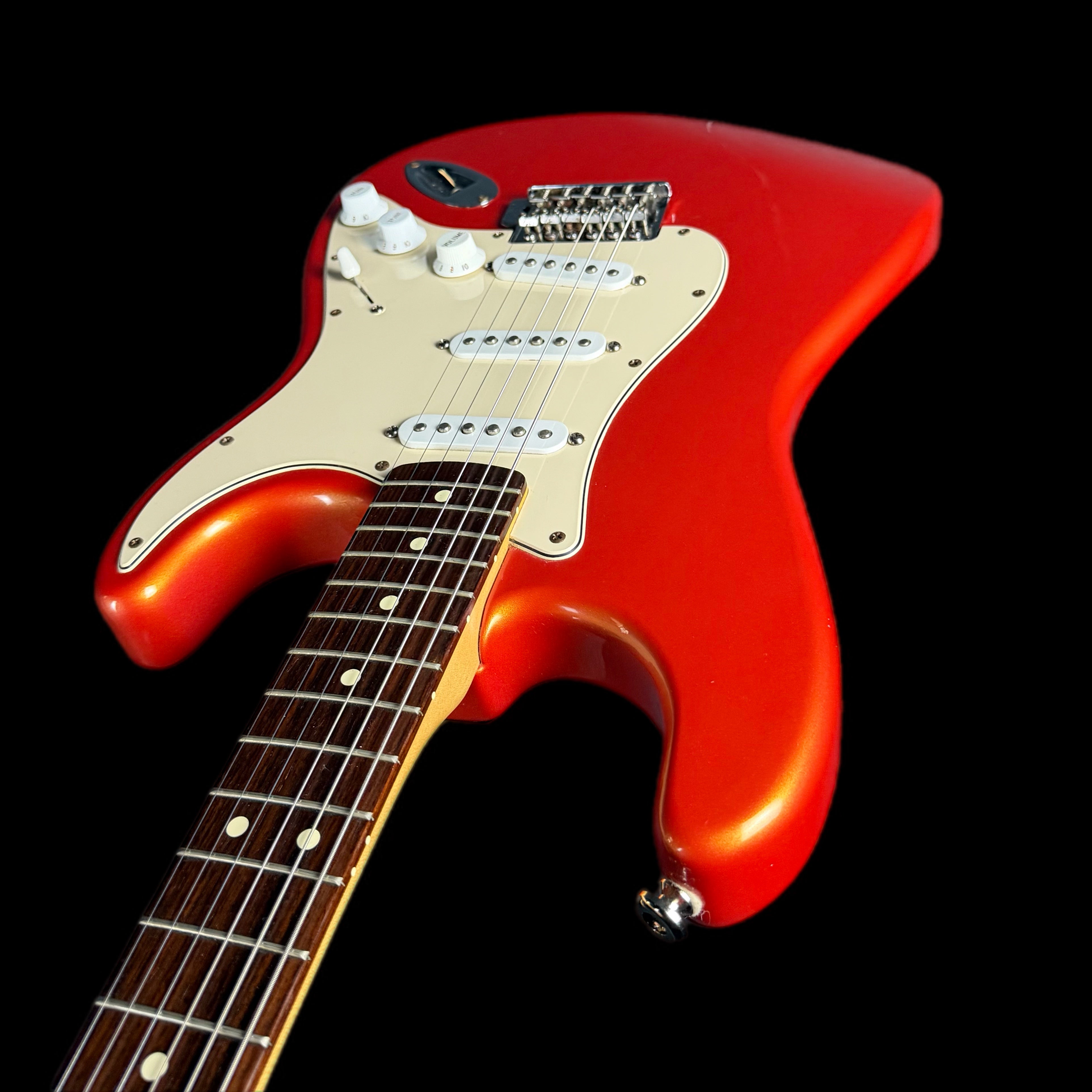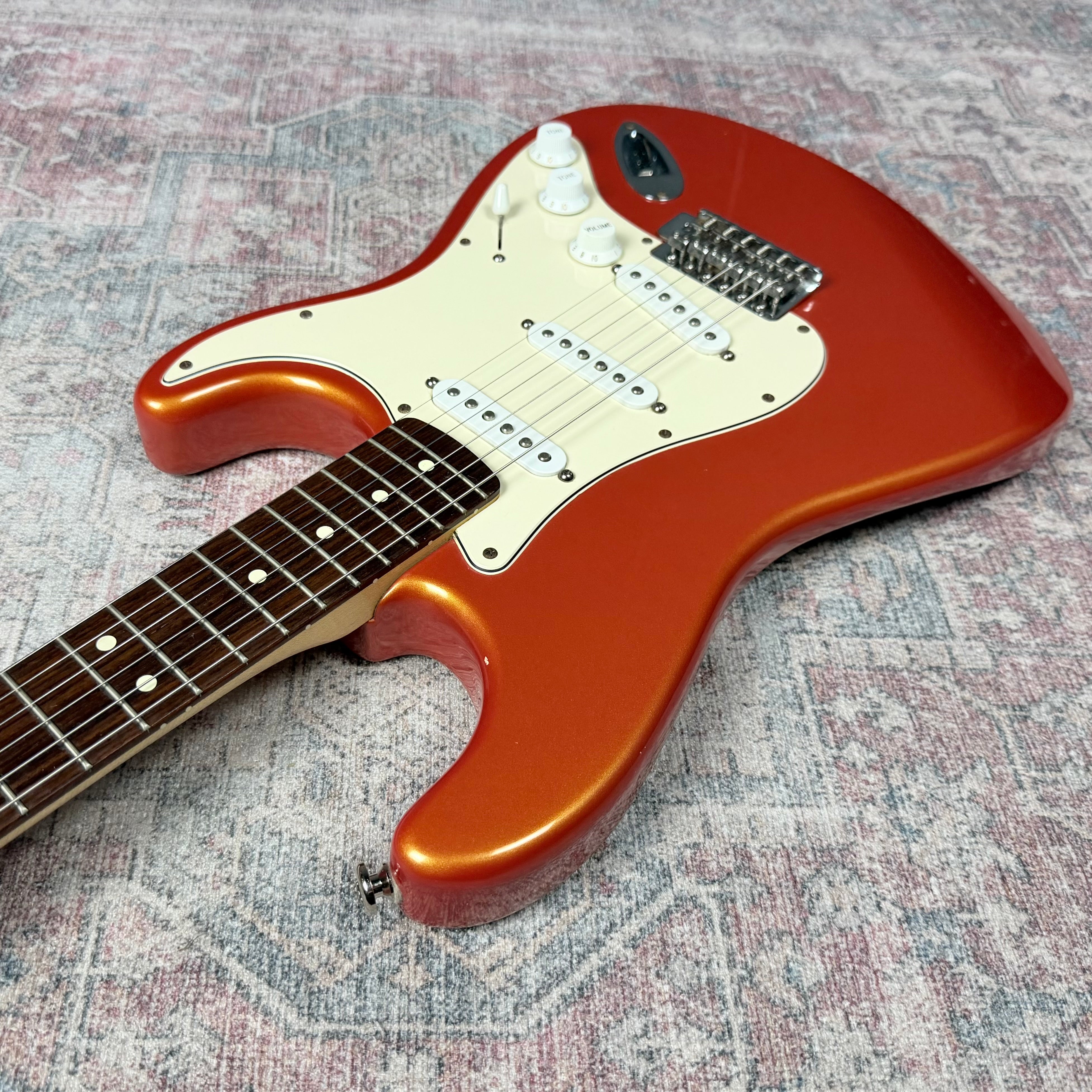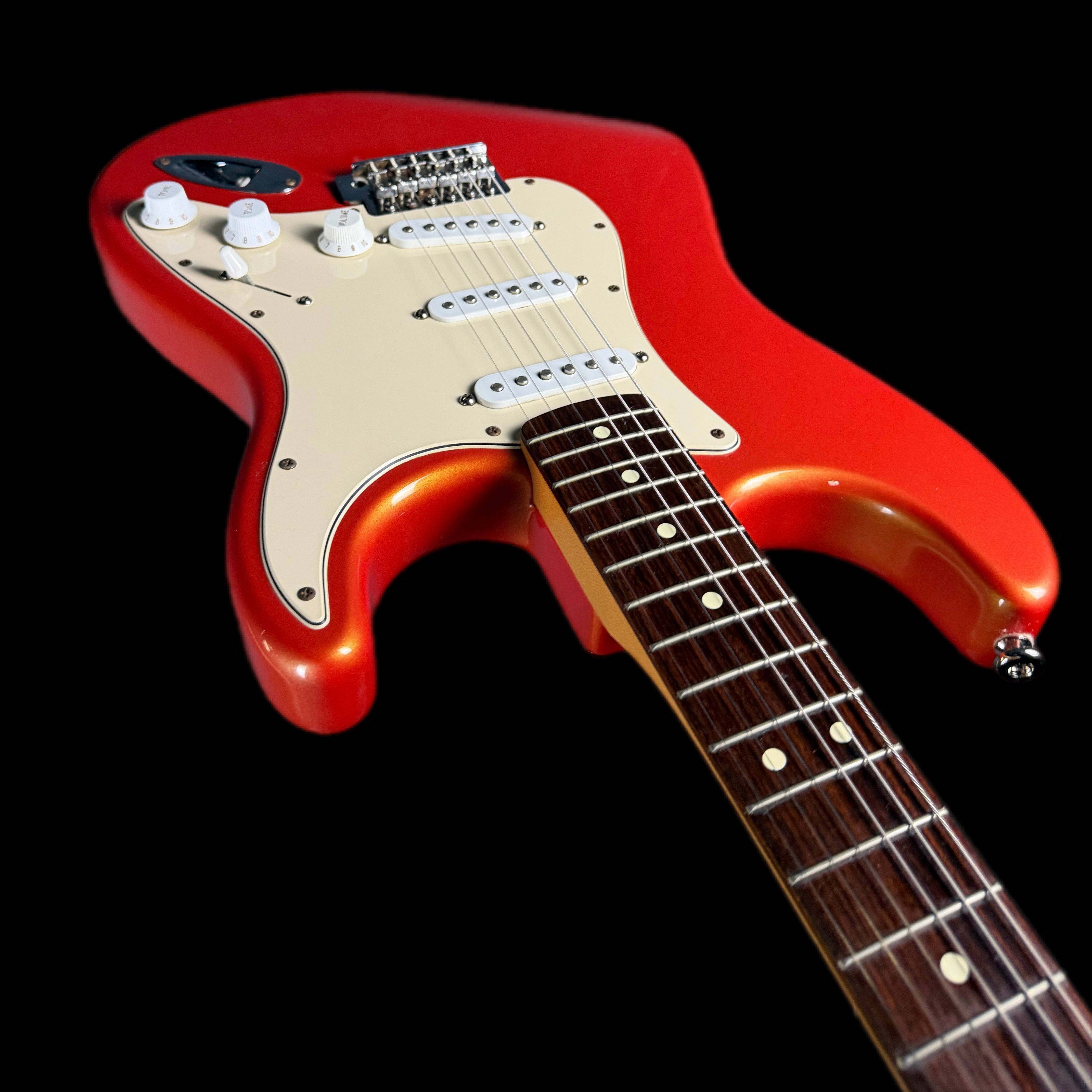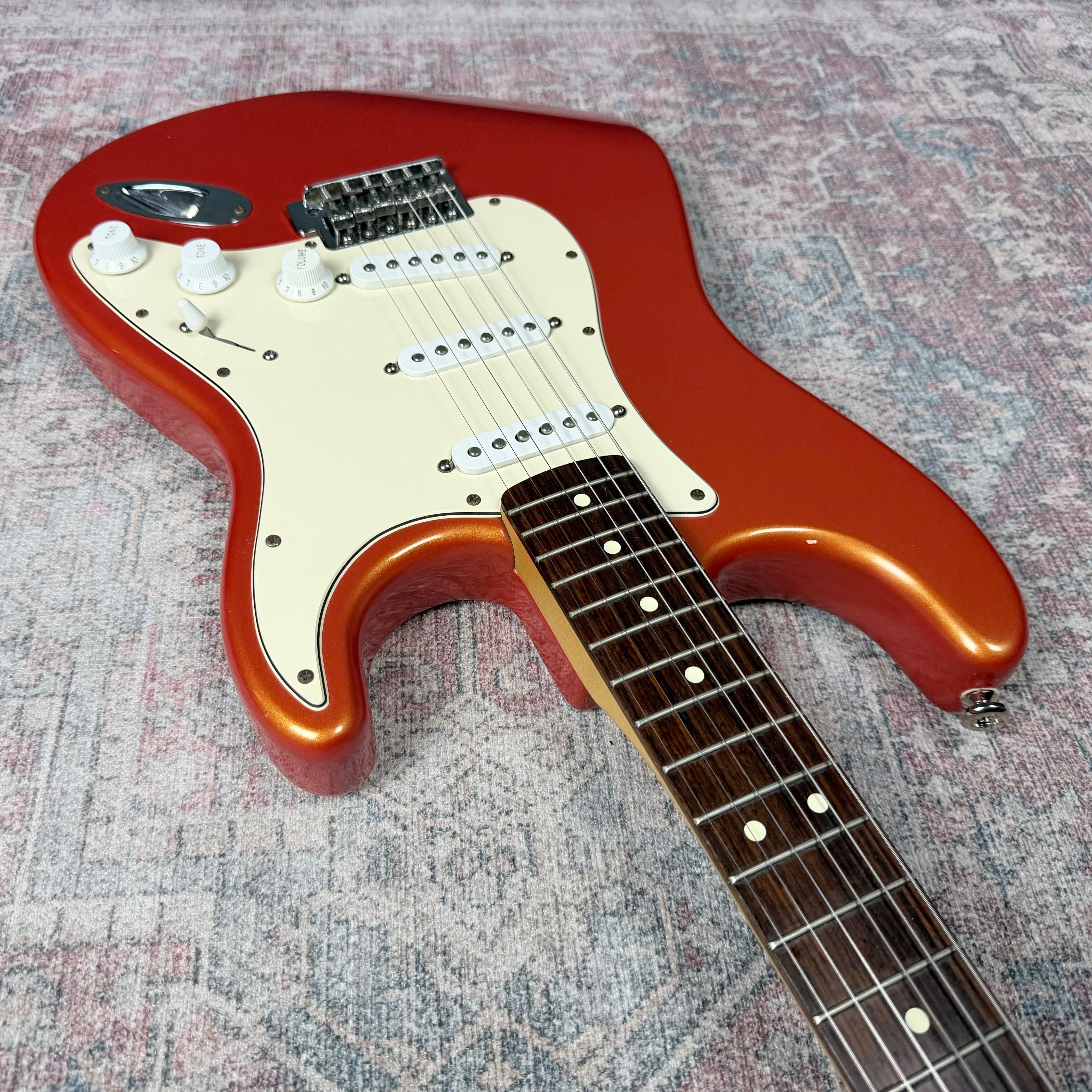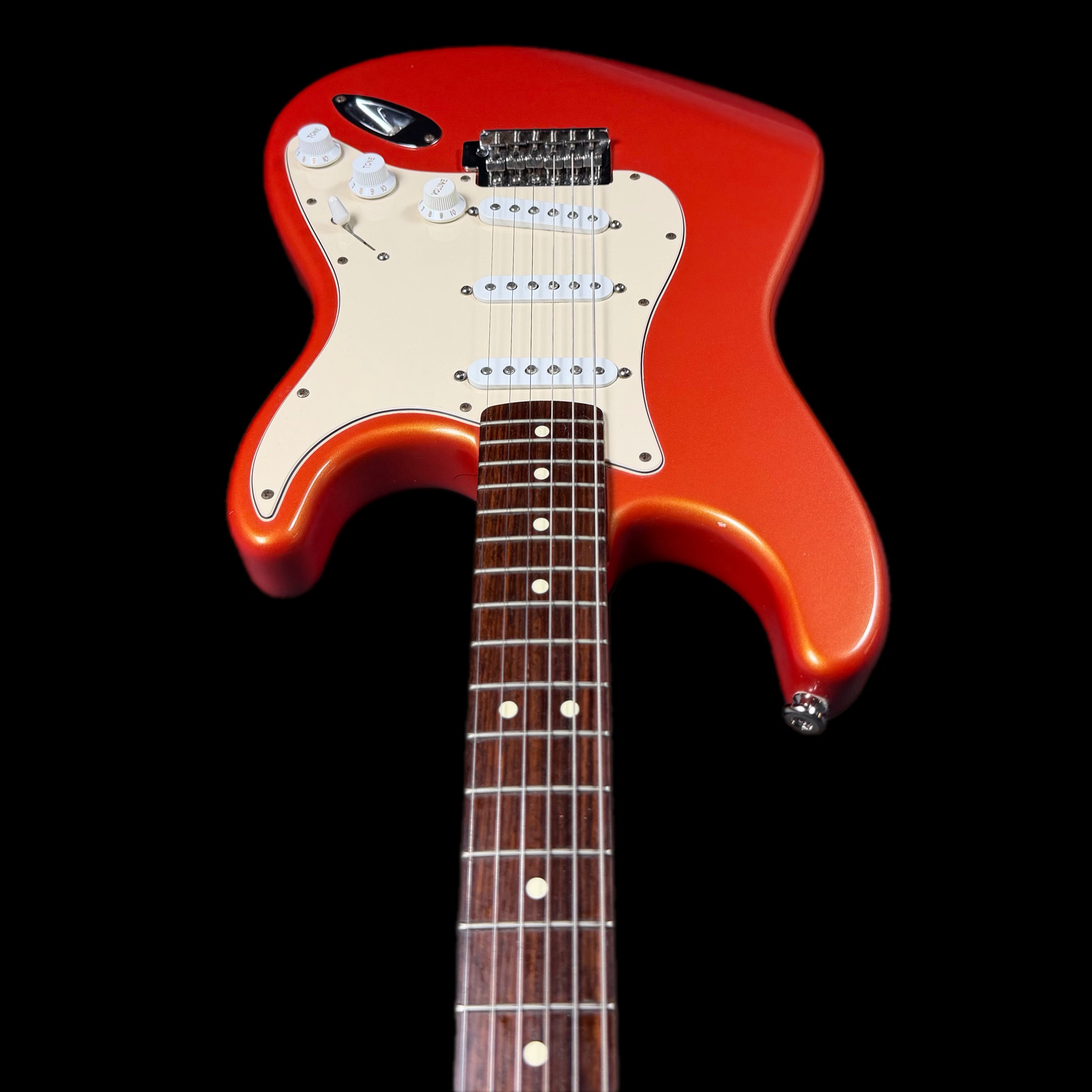 2004 Fender Standard Series Stratocaster featuring a rosewood fingerboard, professionally refinished in a striking TVR Chameleon Orange. Under the lights it shifts and pops, giving the classic Strat silhouette a fresh, modern edge.