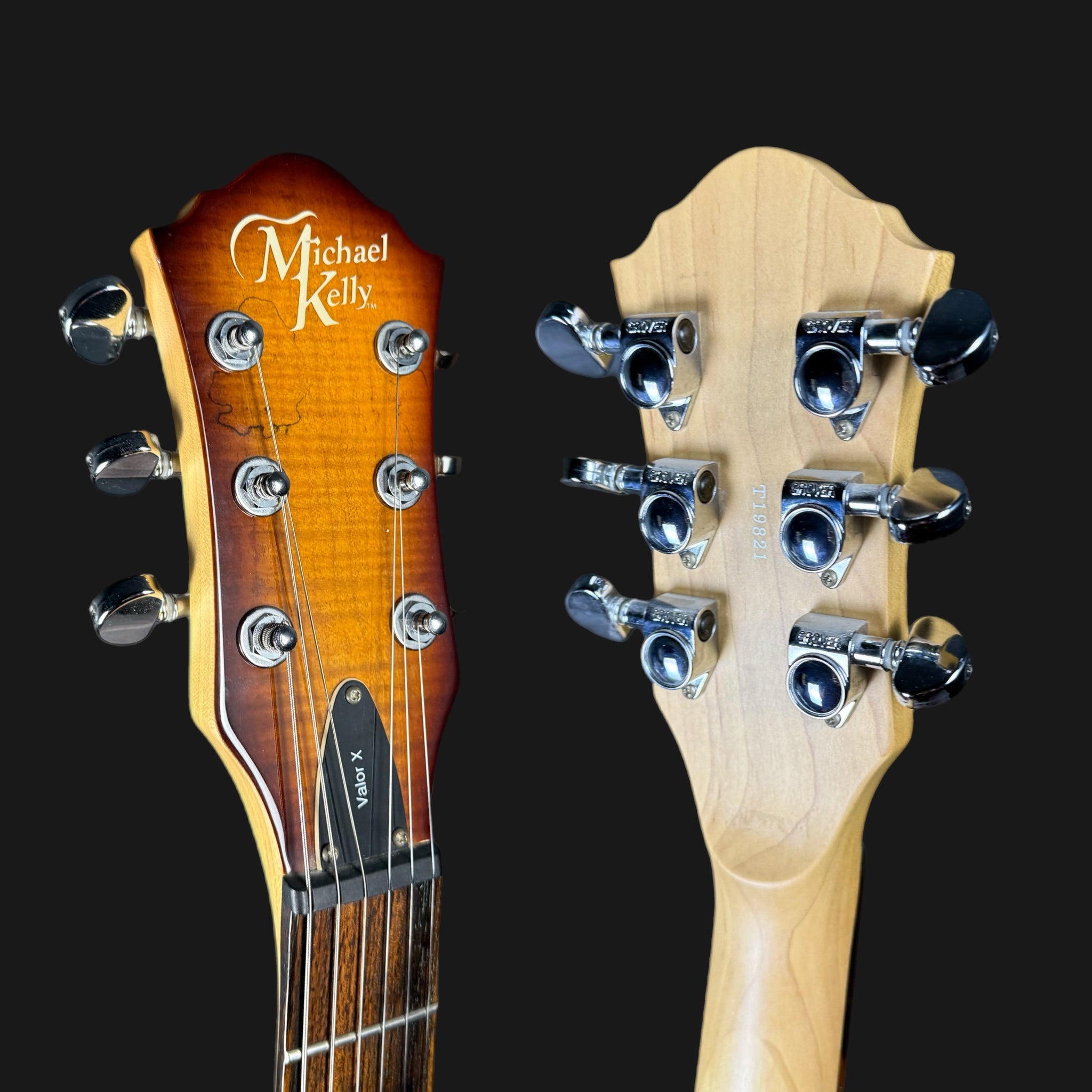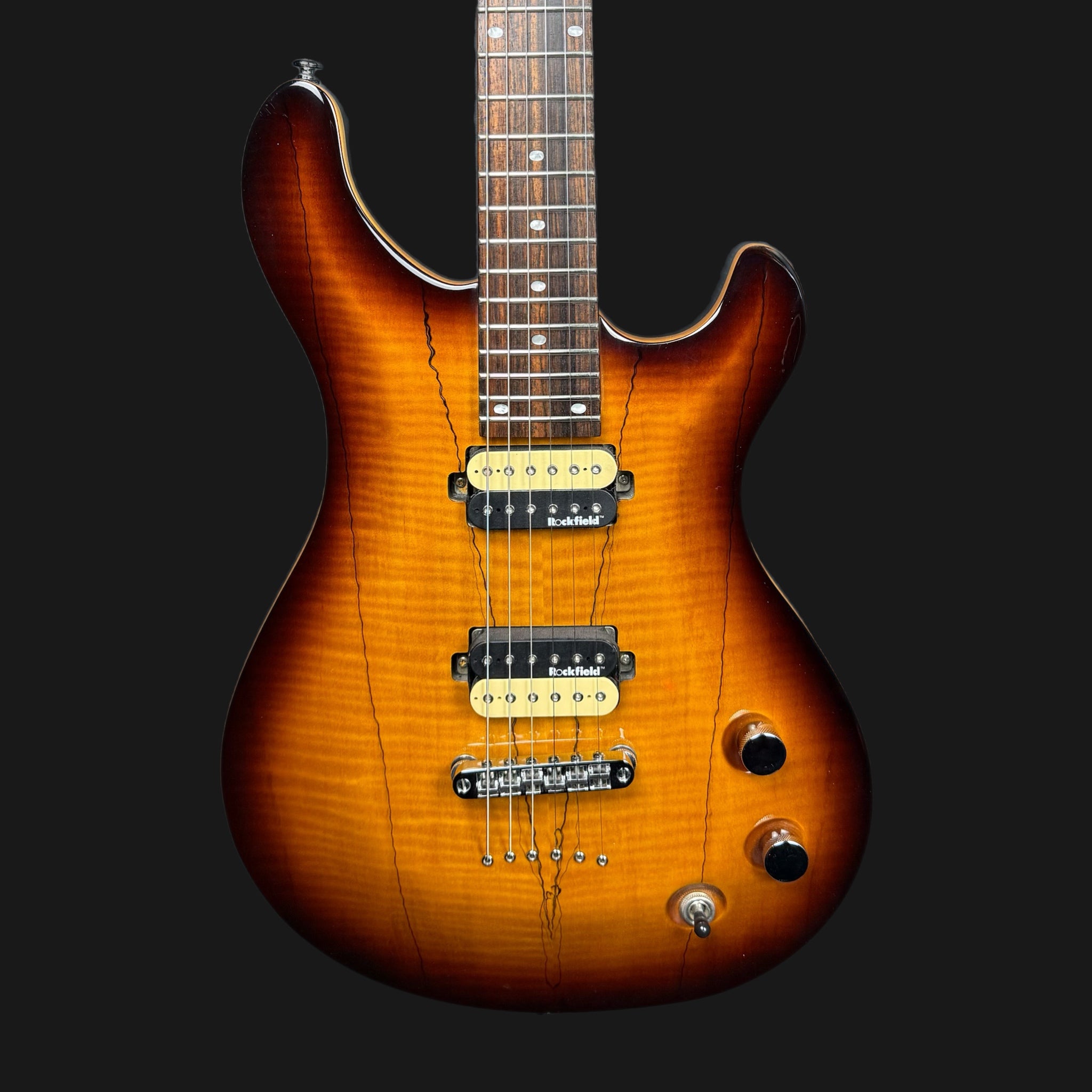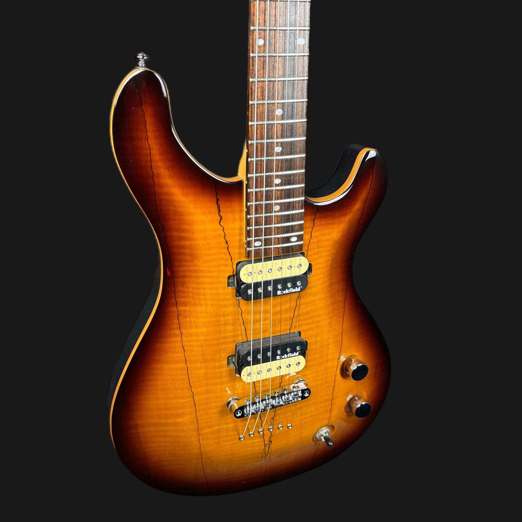 Here we have the utterly sublime Michael Kelly Valor X, with a beautiful spalted maple top, and lovely binding. The neck is extrememly comfortable, and has a slim, flatter profile for speed. The Rockfield Mafia pickups are powerful, yet versatile. Both can be coil tapped to give a single coil sound, and are warm and fat in tone when used as humbuckers. The finish is astonishing for the money, just look at it!