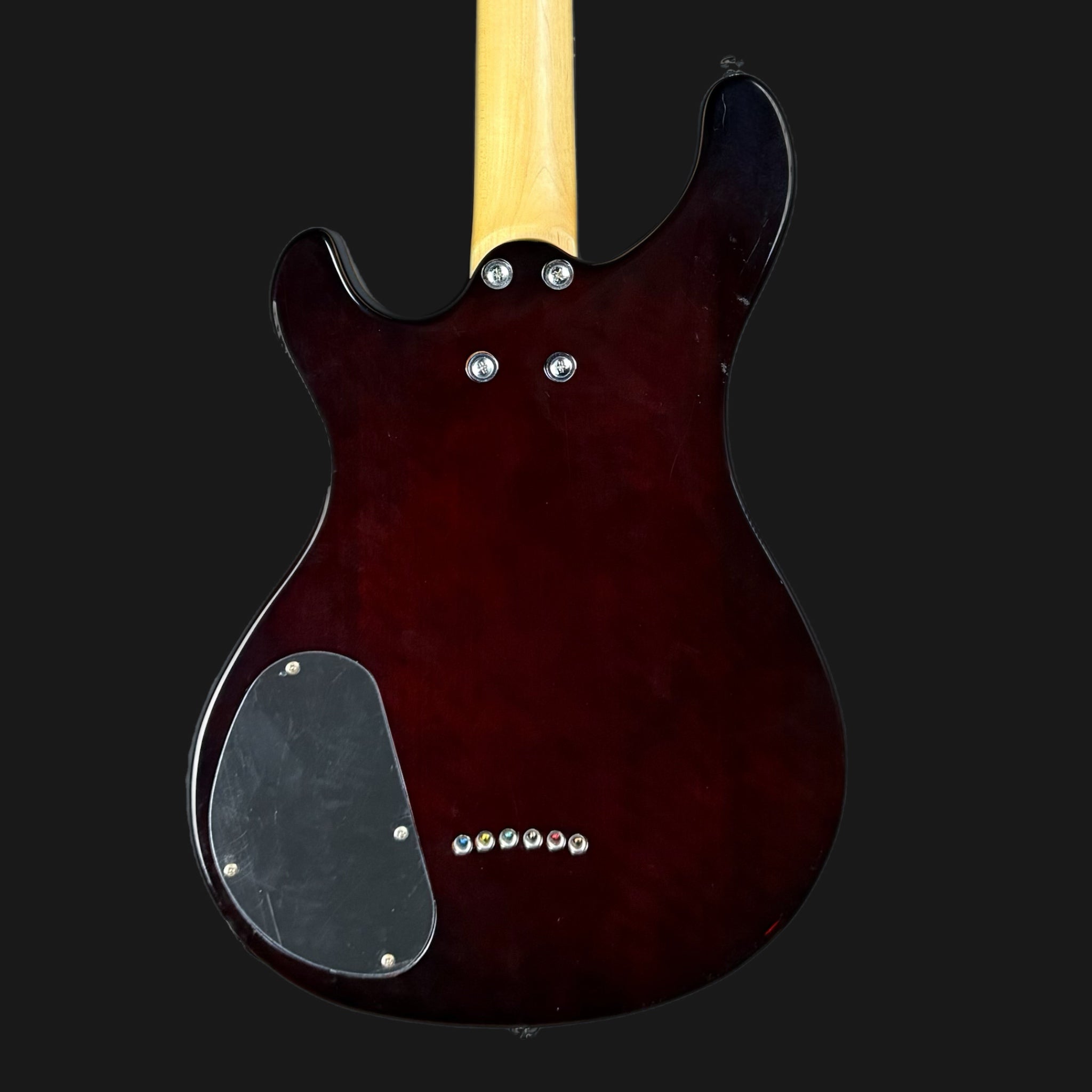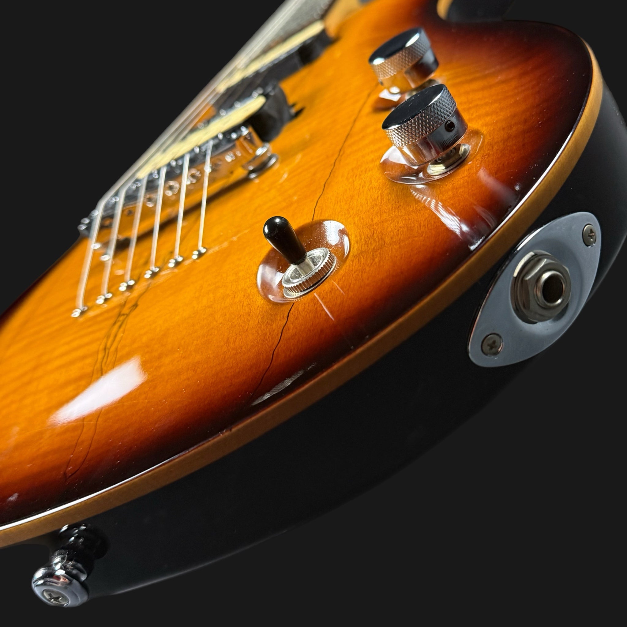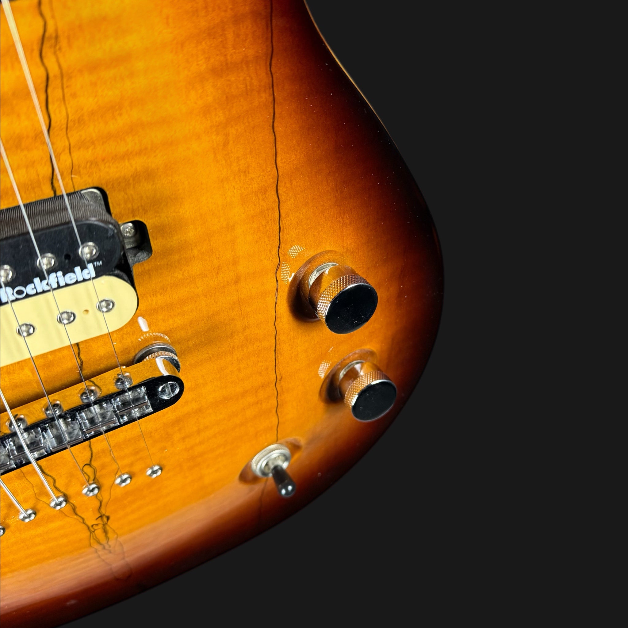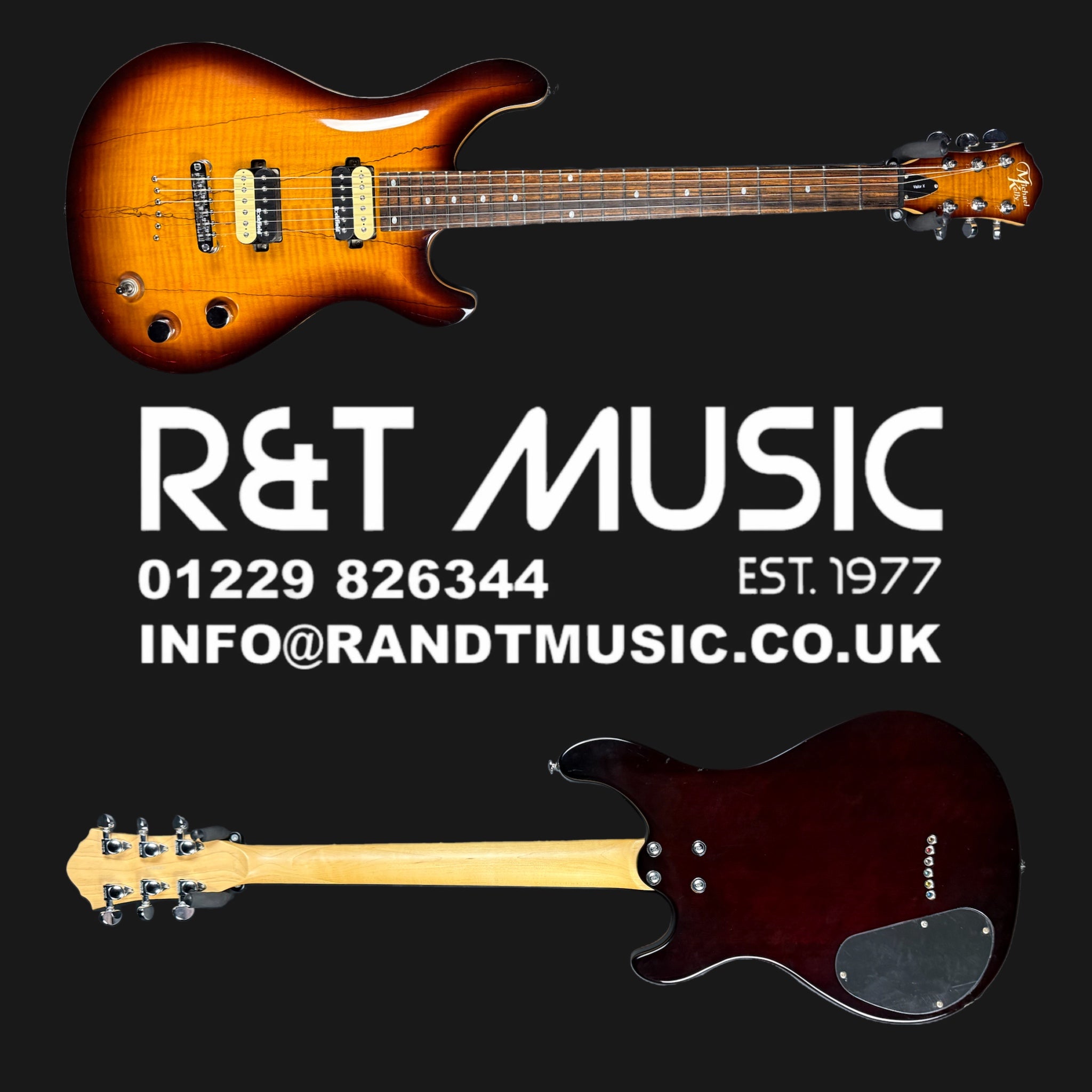 Here we have the utterly sublime Michael Kelly Valor X, with a beautiful spalted maple top, and lovely binding. The neck is extrememly comfortable, and has a slim, flatter profile for speed. The Rockfield Mafia pickups are powerful, yet versatile. Both can be coil tapped to give a single coil sound, and are warm and fat in tone when used as humbuckers. The finish is astonishing for the money, just look at it!