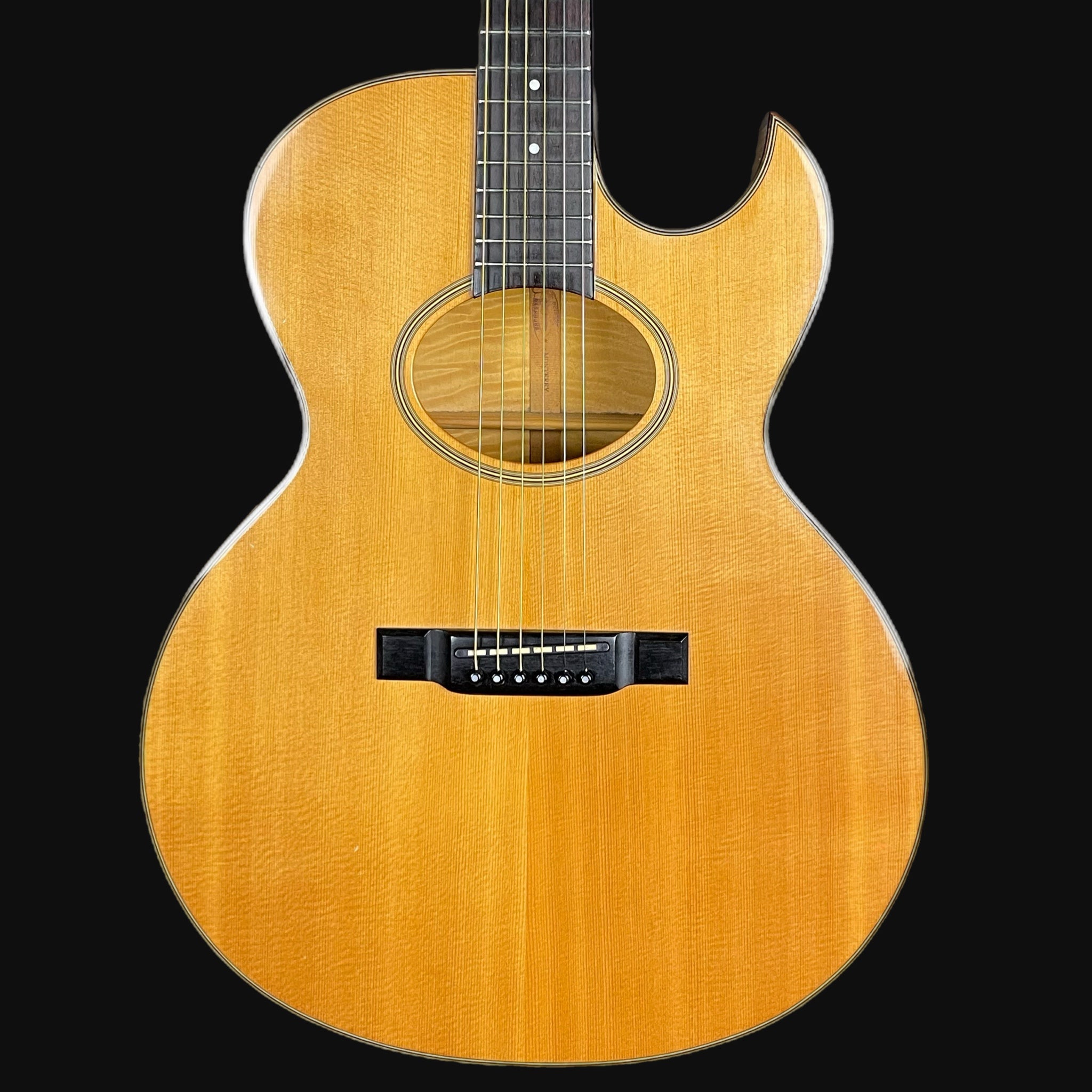 This model features a solid cedar top paired with beautifully flamed maple back and sides, delivering both warmth and sparkle in equal measure. The craftsmanship from this era of Washburn’s Japanese production is widely respected, offering tone and build quality that easily rival many high-end acoustics of its day.