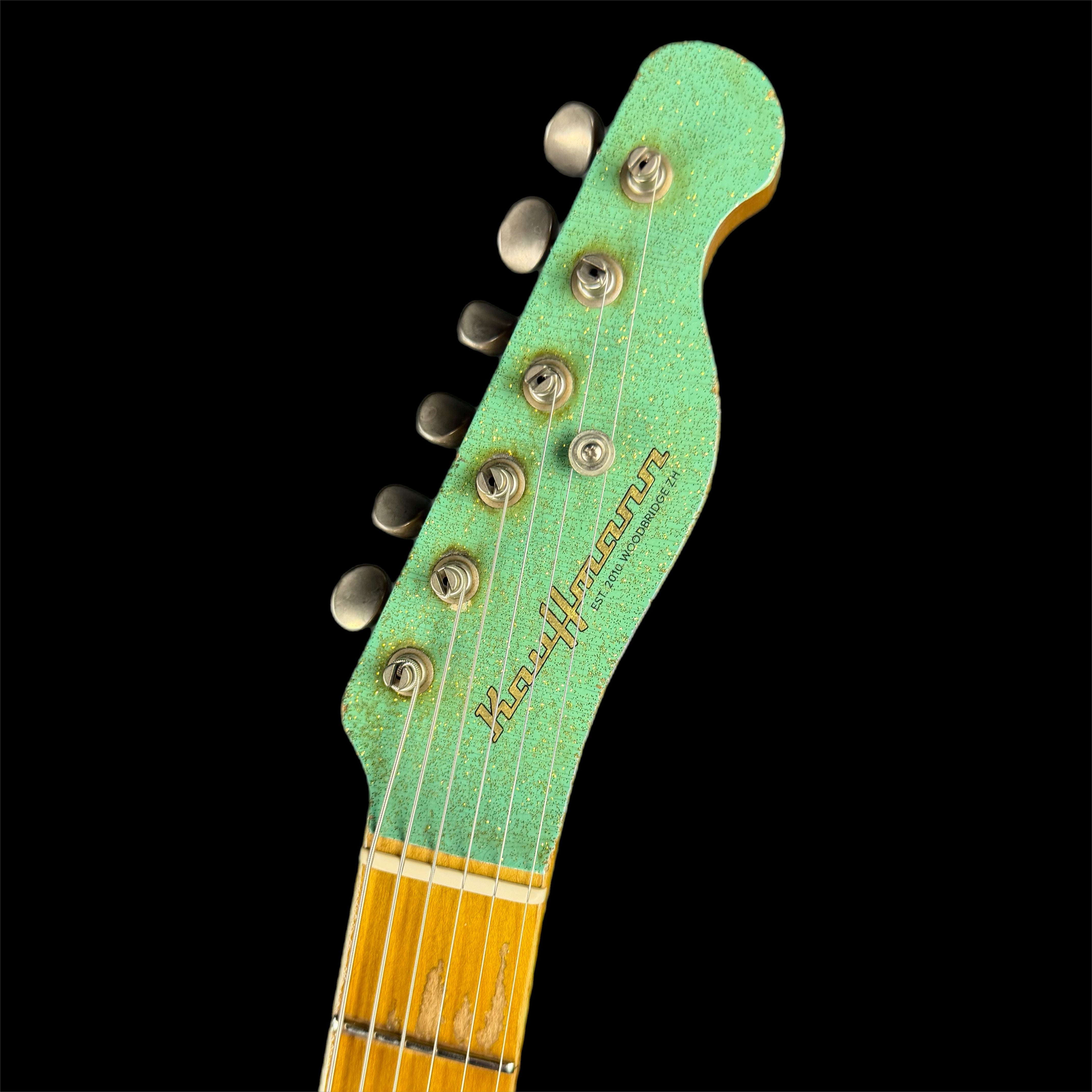 On board you will find the Kauffmann pickups when it is single coil. They are best described as a creamy bluesy sound without losing that vintage transparency. They use CTS pots, vintage wire and put in a treble bleed. On the HS models we combine a Kauffmann bridge pickup with a Amber humbucker. And add a coil split.