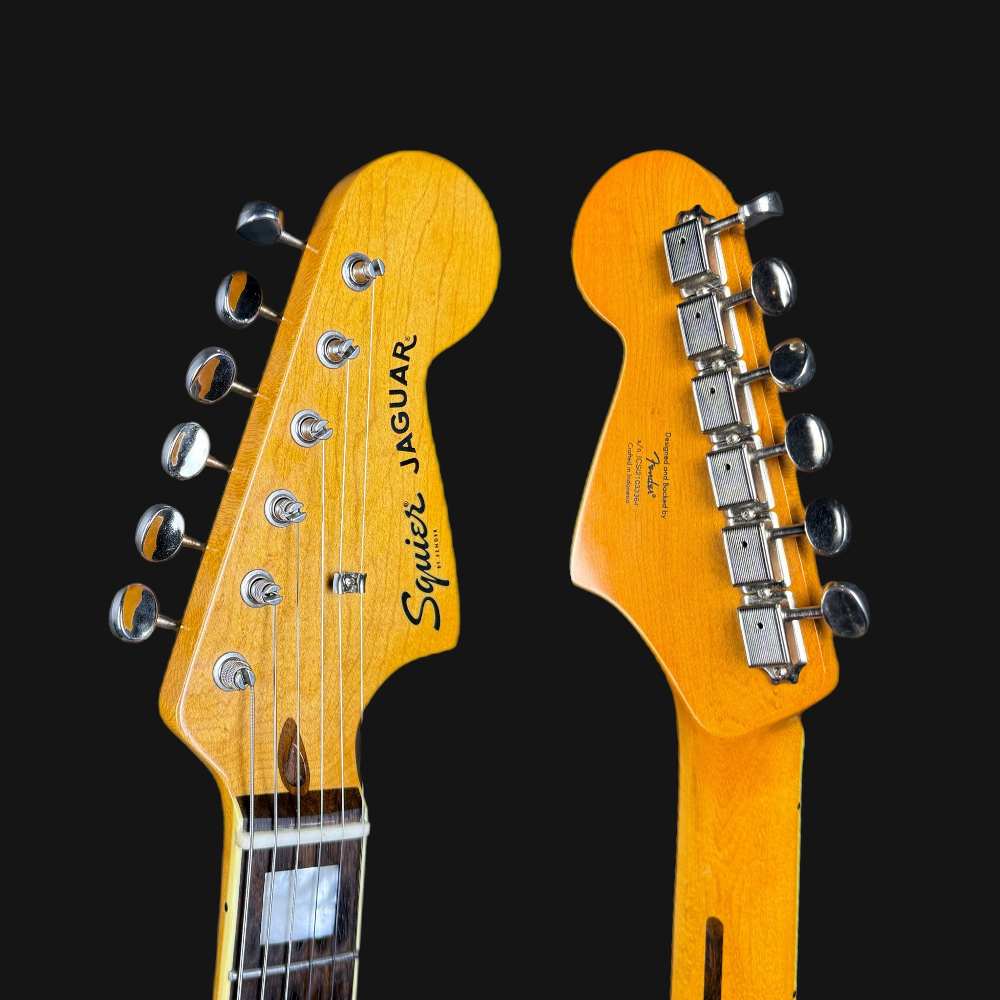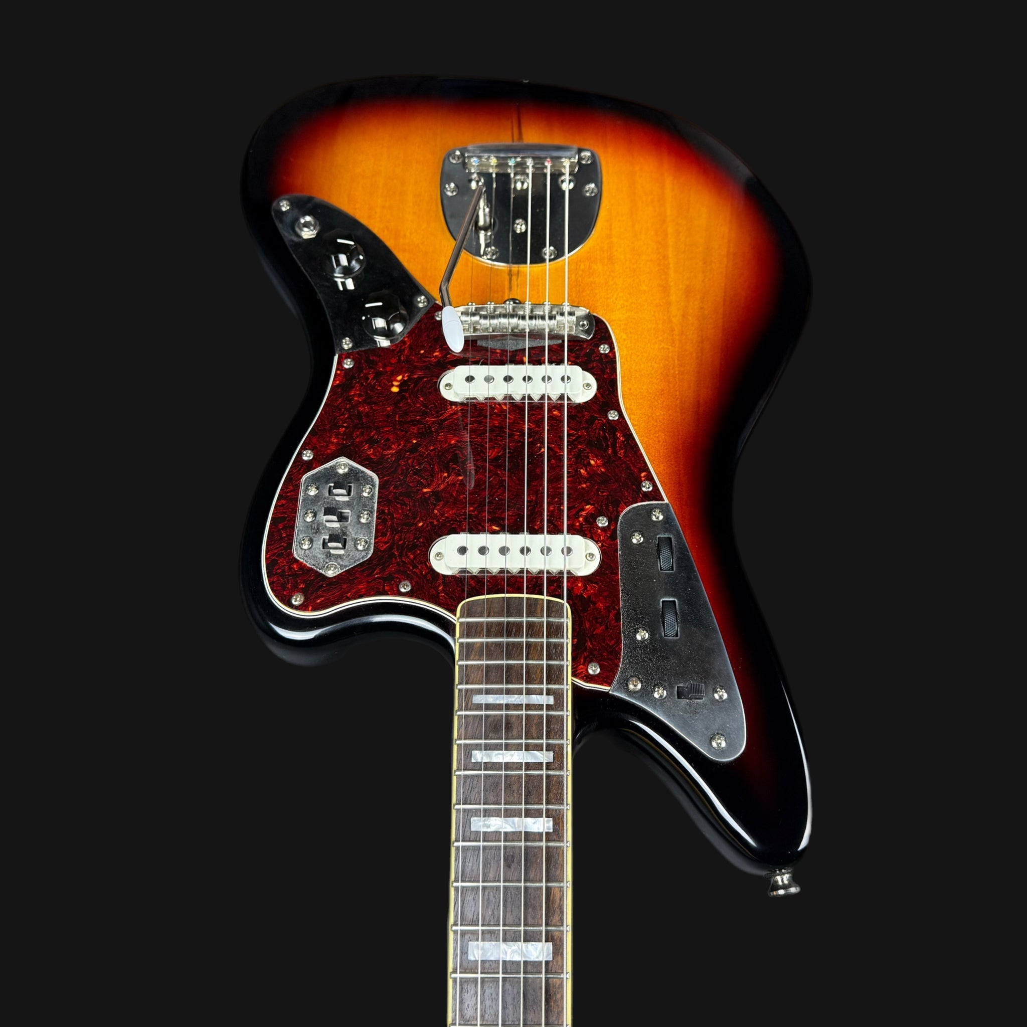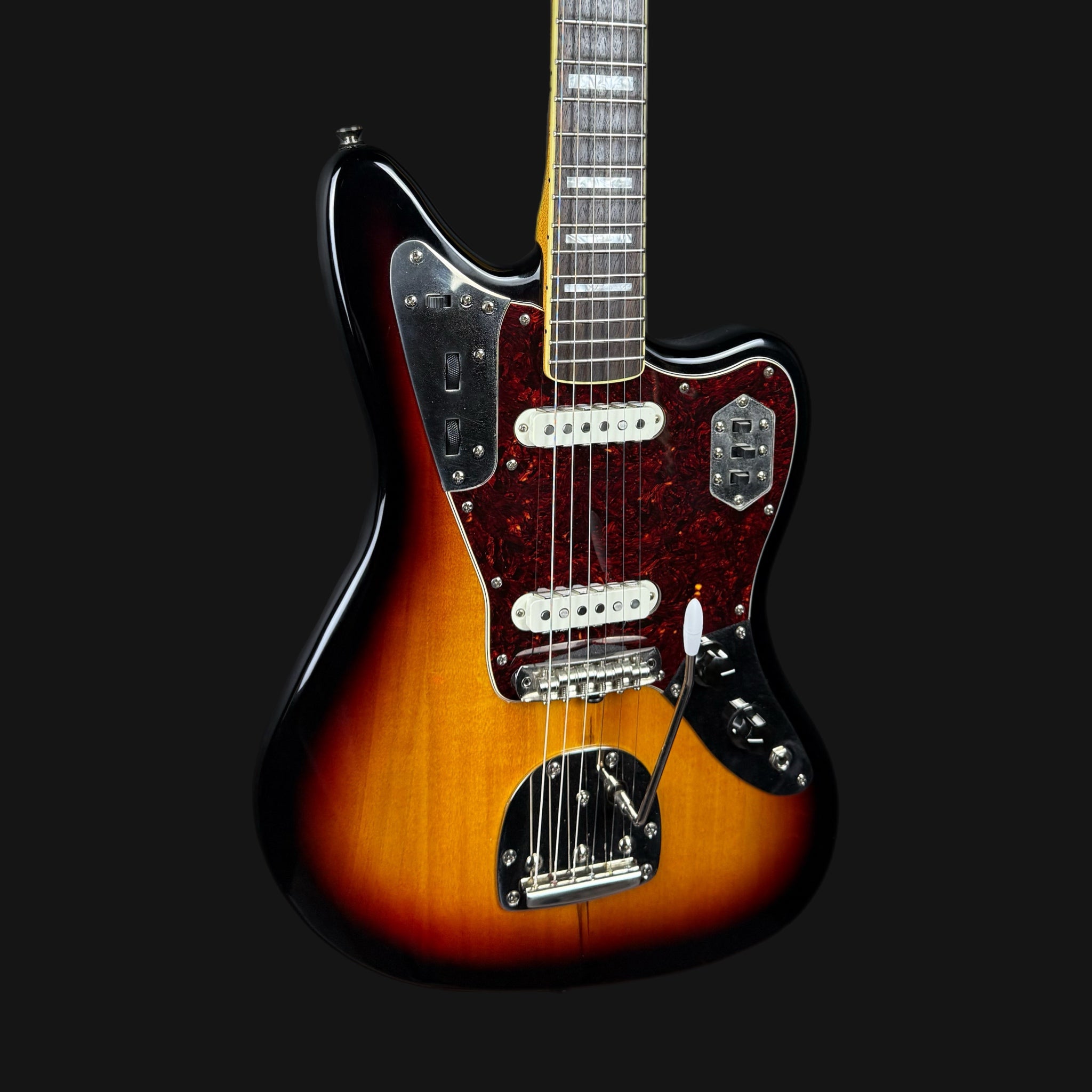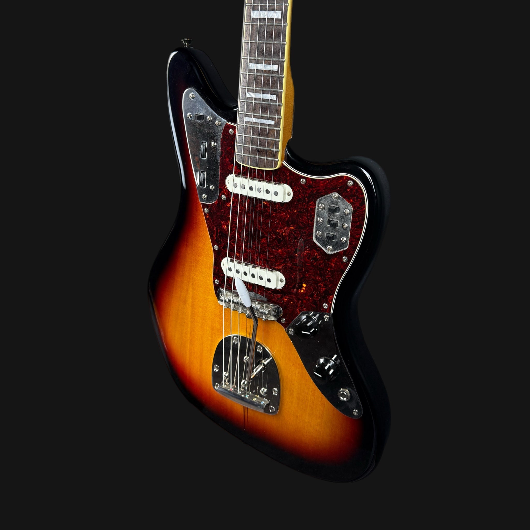 The Jaguar is a type of electric guitar made by Fender, introduced in 1962. It has a shorter string length (24 inches), a special pickup system and tuning mechanics that allow for a variety of tonal possibilities. Popular for its bright, crisp tone and complex circuitry, the Jaguar is often used in surf rock, indie and alternative music.